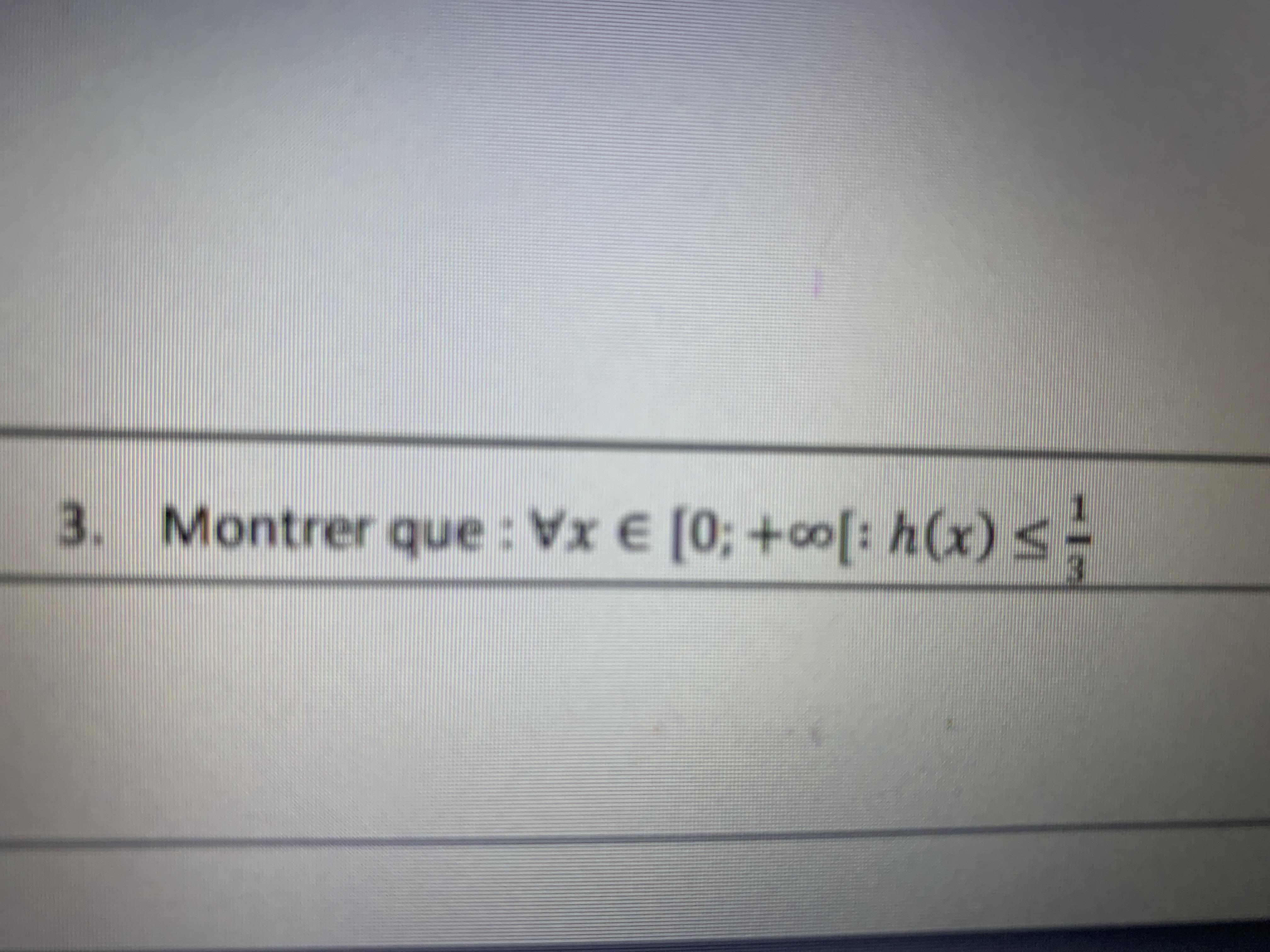 E-Bahut Barbidoux Posté(e) le 17 mars 2020 E-Bahut Signaler Posté(e) le 17 mars 2020 le maximum global de h(x) valant 1/3 il est évident que h(x)≤1/3 sur ]-∞, ∞[ et donc sur [0,∞[