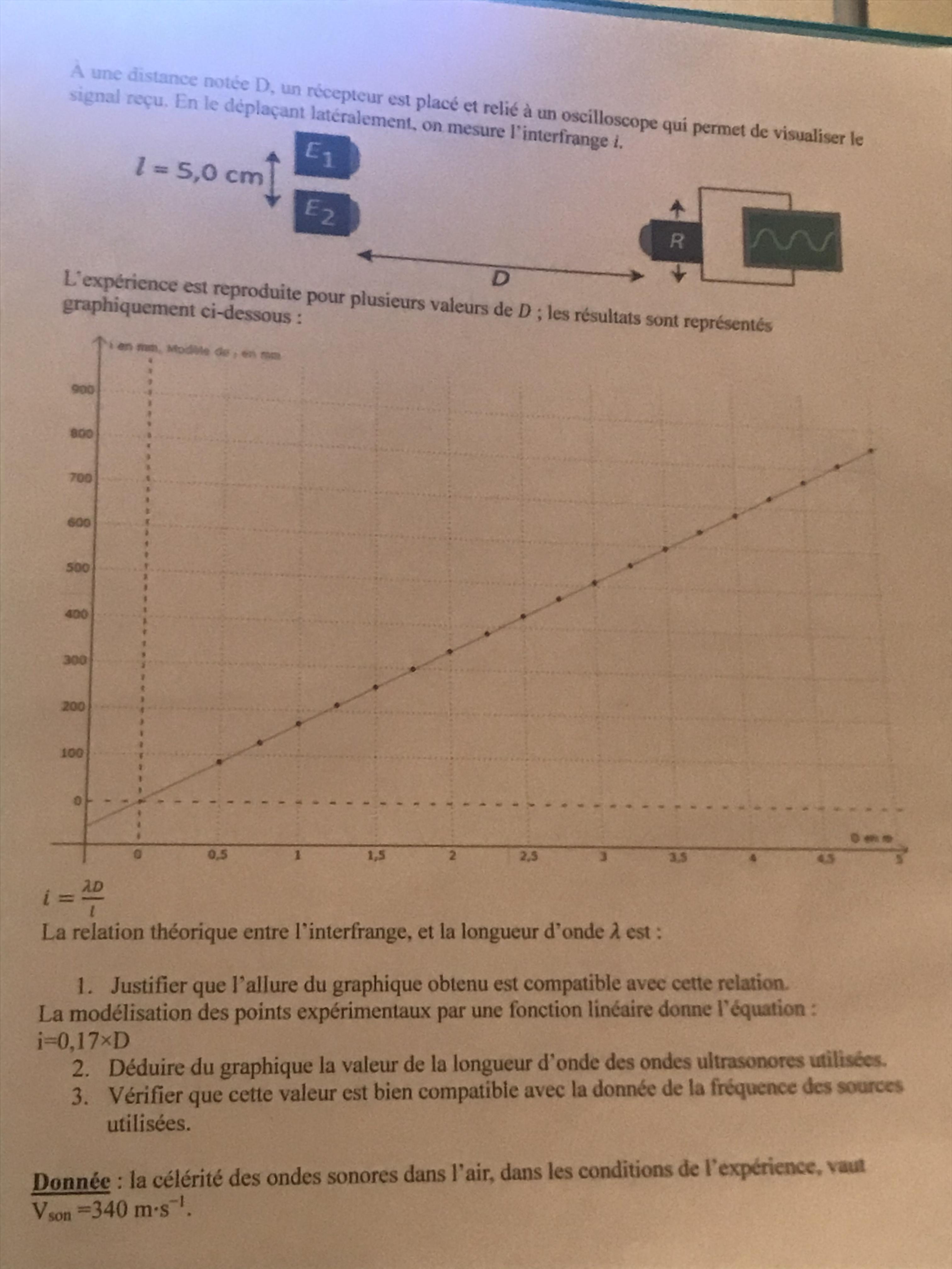 E-Bahut Barbidoux Posté(e) le 19 mars 2020 E-Bahut Signaler Posté(e) le 19 mars 2020 1——————— i=lamda*D/L est une relation linéaire de D lorsque lambda et L sont fixés. 2——————— lambda /L=0.17 ==> Lamda = 0.17*L=0.17*0.05=0.0085 m 3——————— f*lambda=v ==> v=40*10^(3)*0.0085=340 m/s