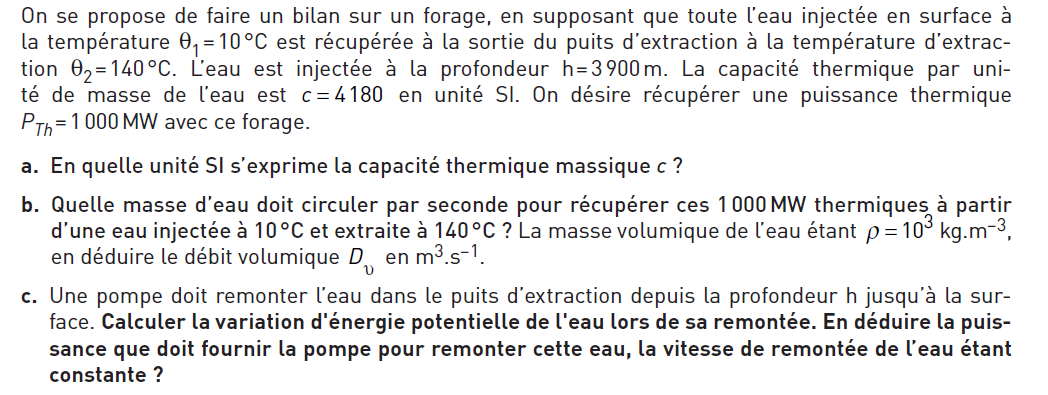 E-Bahut Barbidoux Posté(e) le 29 mars 2020 E-Bahut Signaler Posté(e) le 29 mars 2020 Le 25/03/2020 à 12:49, Black Jack a dit : b) Pour moi, on ne peut pas calculer avec les données fournies ... car l'eau change d'état (liquide-vapeur) et il semble bien que l'auteur n'en a pas tenu compte puisque ni chaleur la chaleur latente de vaporisation ni la capacité thermique massique de la vapeur n'ont été fournies. On peut considérer que l’eau est injectée et extraite à une pression suffisante pour qu’elle ne subisse aucun changement de phase. Ceci-dit l’énoncé aurait pu le préciser car sans cela on peut légitimement se poser la question. A ma connaissance l’étude et l'exploitation des diagrammes de phase n'est pas au programme des terminales.