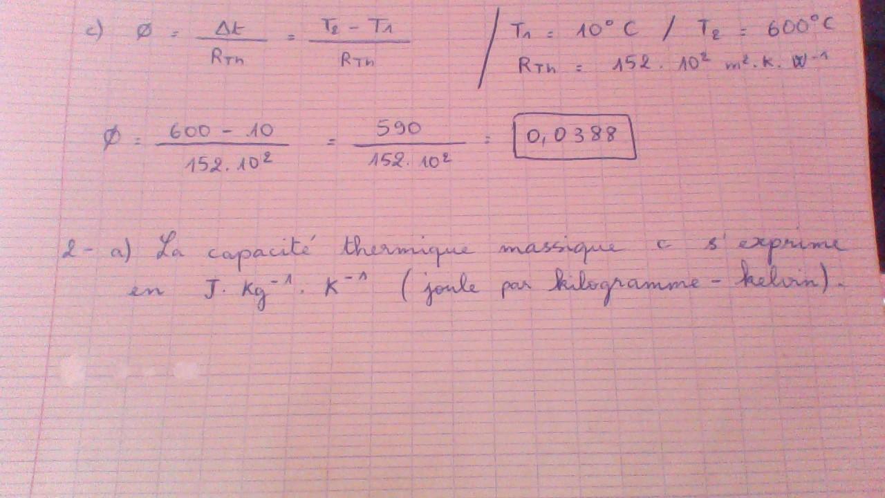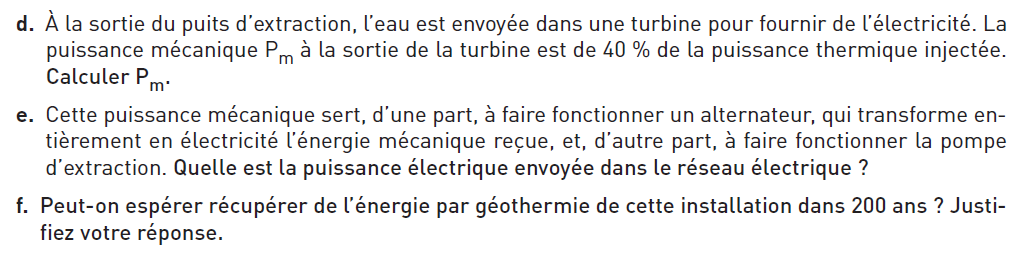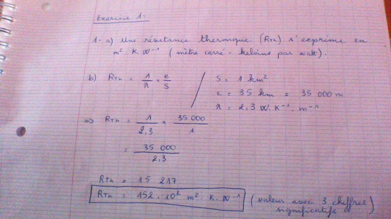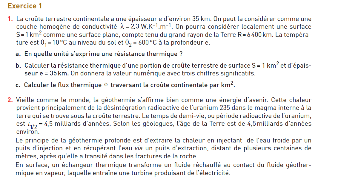 Black Jack Posté(e) le 25 mars 2020 Signaler Posté(e) le 25 mars 2020 Bonjour, 1) Voir ici : https://fr.wikipedia.org/wiki/Résistance_thermique_de_conduction a) Résistance thermique : en °C/W (ou K/W) Certains utilisent une autre définition de la résistance thermique ... et alors on a comme unité : m².K/W ceci est souvent dans l'industrie du bâtiment pour les isolants. b) Lambda * S/e = 2,3 * 10^6/35000 = 65,71 W/K Rth = 1/65,71 = 0,0152 K/W (autre réponse évidemment si on utilise le m².K/W) c) Delta theta = 600-10 = 590 K Flux thermique par km² = 590/0,0152 = 38774 W (38,8 kW) ***************** 2) Infos de l'énoncé pas très bonnes. Le U235 a une demi vie de 703,8.10^6 ans Le U238 a une demi vie de 4,4688 .10^9 ans Et la désintégration naturelle de l'U238 ne passe pas par l'U235 Alors que d'après l'énoncé (même si ce n'est pas explicitement dit) on pourrait penser que la demi vie de l'U235 serait de 4,5 milliards d'année, ce qui est faux. A l'époque de la formation de la Terre, l'U235 était 85 fois plus abondant que l'U238 ... Actuellement, à cause des durées de demi vie des 2 isotopes très différentes, il y a une proportion infime d'U235 par rapport à l'U238 b) Pour moi, on ne peut pas calculer avec les données fournies ... car l'eau change d'état (liquide-vapeur) et il semble bien que l'auteur n'en a pas tenu compte puisque ni chaleur la chaleur latente de vaporisation ni la capacité thermique massique de la vapeur n'ont été fournies. On peut évidemment les trouver sur le net ... pas de là à penser que l'auteur du problème en a tenu compte ...