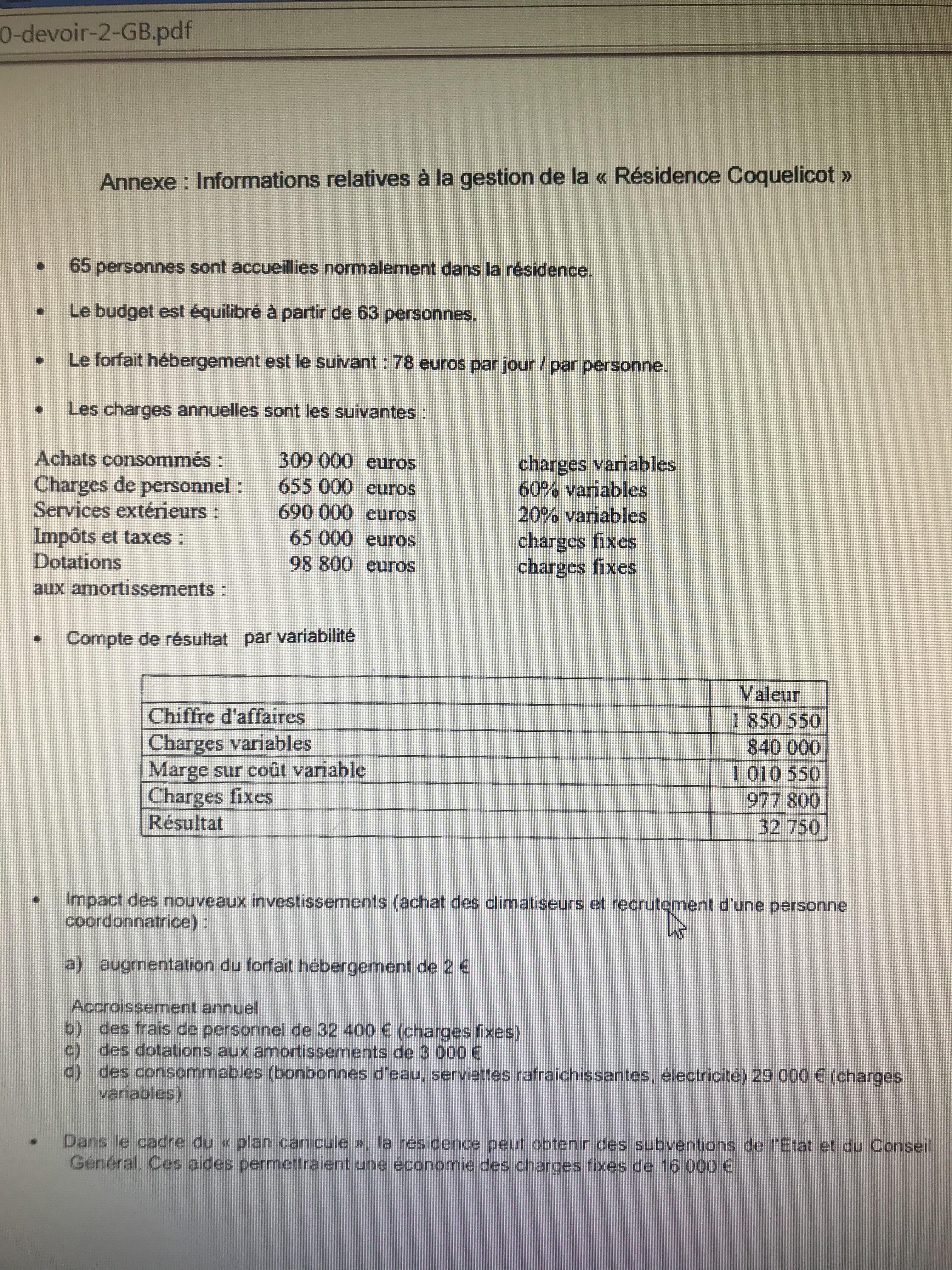 tulbe Posté(e) le 31 mars 2020 Signaler Posté(e) le 31 mars 2020 bonjour j'ai besoin d'aide sur ce sujet svp vous pouvez m'aidez Vous êtes employé(e) dans la maison de retraite médicalisée « Résidence Coquelicot ». La structure, ouverte aux personnes de plus de 60 ans, peut accueillir jusqu’à 65 résidents. La Direction, conformément au plan Canicule, envisage d’une part de recruter une personne responsable coordinatrice ayant une solide expérience en gérontologie et d’autre part de réaliser des investissements pour le rafraîchissement de l’air. Etude financière du projet d’investissement Vous êtes chargé(e) d’étudier l’impact financier qu’auront le recrutement d’un(e) responsable coordonnateur(trice) et l’acquisition de matériel sur le résultat de l’établissement. Ces investissements vont entraîner une modification des charges de l’établissement. Il convient également de prendre en compte certaines mesures du gouvernement qui ont pour objectif d’aider les maisons de retraite à se mettre en conformité avec la nouvelle réglementation. A l’aide des informations de l’Annexe, répondez aux questions suivantes : 1. Mesurez les effets des investissements sur l’équilibre financier de la résidence : - sans les subventions. - avec les subventions. 2. Interprétez les résultats obtenus et proposez des solutions susceptibles de faire évoluer la situation financière.