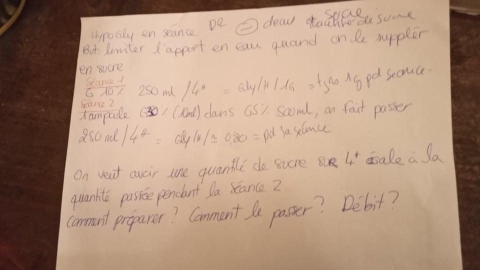 nath28 Posté(e) le 3 avril 2020 Signaler Posté(e) le 3 avril 2020 BONJOUR, je suis étudiante infirmière, en dialyse. La tutrice m'a donné ce calcul de dose . Je me tourne vers vous, car j'ai fait des calculs et je ne sais pas si c'est juste et je suis perdu dans les calcul il faut donné moins d'eau, mais plus de sucre. a la seance 1: G10% (500ml),passé 250ml/4H = les G10% est en pénurie je sais que le G30% ( 10ml)= 3g/10ml et le G5% (500ml) = 25g/500ml on veut passé que 250ml/4h. qui veut dire 12,5g/250ml après je suis perdu
