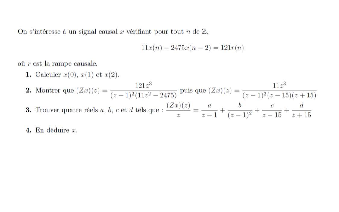 E-Bahut julesx Posté(e) le 6 avril 2020 E-Bahut Signaler Posté(e) le 6 avril 2020 J'essaie pour le début, mais sans garantie. Si un spécialiste pouvait voir tout cela ? 1) * x(0) x(-2)=0 signal causal r(0)=0 => x(0)=0 * x(1) x(-1)=0 idem r(1)=1 => x(1)=121/11=11 * x(2) x(0)=0 r(2)=1 => x(2)=121*2/11=22 2) 11x(n)-1275x(n-2)=r(n) => (Zx)(z)(11-1275z-2)=z/(z-1)² voir tables de transformées => (Zx)(z)=z/(z-1)²/(11-1275z-2) qu'on multiplie par z² au numérateur et au dénominateur pour obtenir la forme de l'énoncé Cf. post ci-dessus pour la fin. 3) Autre possibilité pour la décomposition * multiplier de chaque côté par (z-1)² et remplacer z par 1 => b=-11/224 * multiplier de chaque côté par z-15 et remplacer z par 15 => c=165/392 * multiplier de chaque côté par z+15 et remplacer z par -15 => c=-165/512 * multiplier de chaque côté par z-1 et faire tendre z ver l'infini ou remplacer z par 0, par exemple. Je te laisse faire le calcul ! J'obtiens a=2475/25088 avec un logiciel de calcul formel. Bon courage ! 4) Utilise les tables de transformées inverses.