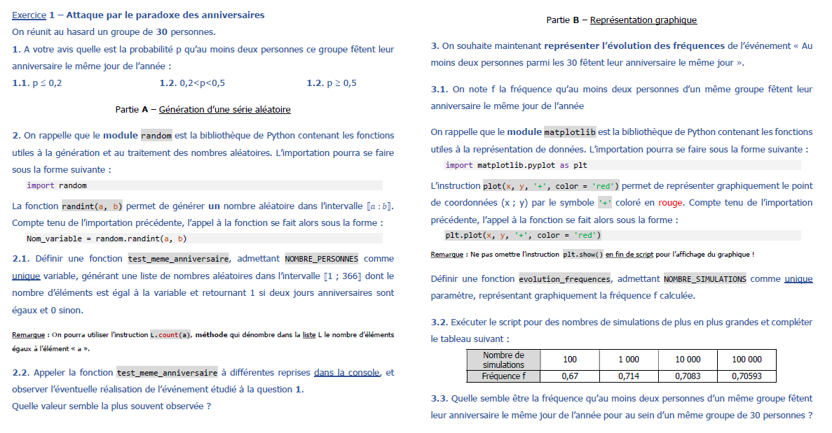 angelV Posté(e) le 10 avril 2020 Signaler Posté(e) le 10 avril 2020 Bonjour à tous, c'est encore moi, car oui j'ai quelques difficultés en Informatique. J'ai reçu un nouvel exo par mon professeur comprenant 2 parties. J'ai fais la première partie (A), assez simple mais la deuxième (B) est une autre histoire... Pourrais-je avoir de l'aide pour le terminer ? Voici ce que j'ai fais pour l'instant sur python : import random def test_meme_anniversaire(): liste=[random.randint(1,336) for i in range (1,50)] print(sorted(liste)) for element in liste: if liste.count(element)>1: return 1 else: return 0 print(test_meme_anniversaire())