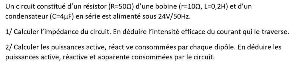 E-Bahut julesx Posté(e) le 21 avril 2020 E-Bahut Signaler Posté(e) le 21 avril 2020 2) R ne consomme qu'une puissance active égale à R*I² => PR=R*i² L consomme une puissance active r*I² et une puissance réactive L*i² => PL=r*I² et QL=L*I² C fournit une puissance réactive égale à 1/(Cw)*I² => QC=-1/(Cw)*I² Pour le total : PT=somme des P QT=somme algébrique des Q S=√(PT²+QT²)