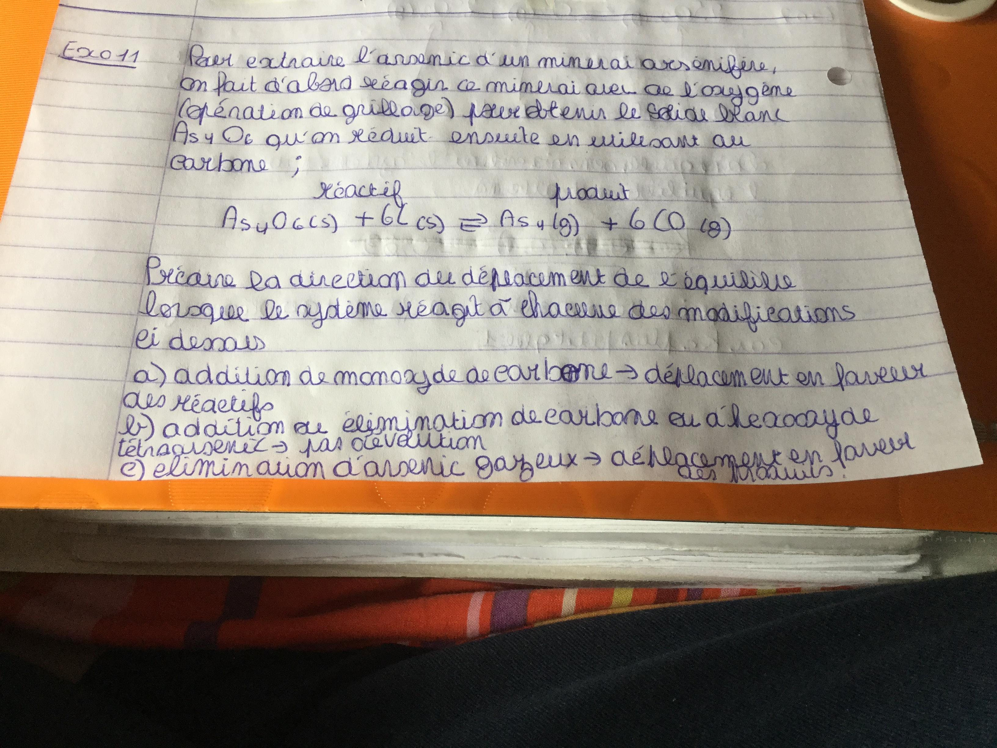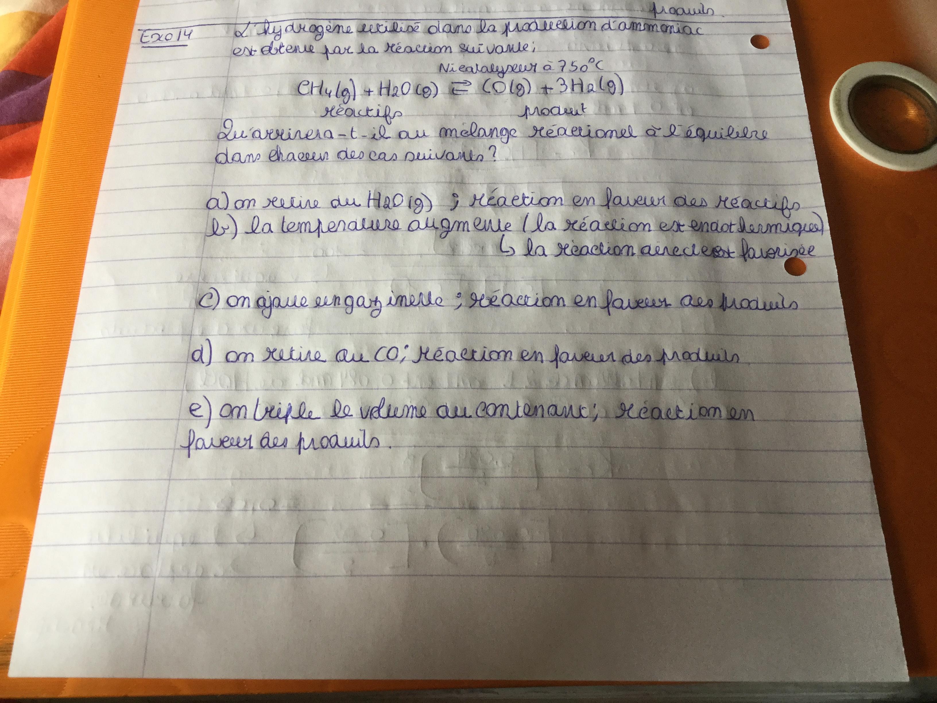 E-Bahut Barbidoux Posté(e) le 4 mai 2020 E-Bahut Signaler Posté(e) le 4 mai 2020 —————————— Exo 7 —————————— La valeur de la constante d’équilibre K est elle donnée ??? Si oui et égale à K=0.23 alors Qr=0.1 <K ==> évolution de l’a réaction dans le sens direct —————————— Exo 10 —————————— OK —————————— Exo 11 —————————— b)- pas d’évolution si et seulement une certaine quantité de réactif est toujours présente—————————— Exo 13 —————————— a)- Ne pas écrire Ke , ce n’est pas un équilibre, la bonne terminologie est Qr (quotient réactionnel) Ici Qr>K ==> réaction se produit dans le sens inverse de son écriture jusqu’à l’obtention d’un équilibre —————— b)- Qr=K=0.09 pas de réaction réactifs et produits sont en équilibre —————— c)- Qr>K ==> réaction se produit dans le sens inverse de son écriture jusqu’à l’obtention d’un équilibre —————————— Exo 14 —————————— Utiliser les termes réaction directe et indirecte (sous entendu dans le sens de son écriture) plutôt qu’en faveur des réactif qui est ambiguë les réactifs étant alors les produits de la réaction…. ——————— c)- J’aurais dit dans le sens de la diminution du nombre total de moles (sens inverse de l’écriture) ——————— Si l’on triple le volume alors Qr<K ==> réaction se produit dans le sens de son écriture jusqu’à l’obtention d’un équilibre —————————— Exo 3 —————————— Ne connaissant pas les conditions initiales en ce qui concerne les produits de réaction dans le sens de leur écriture je ne vois pas comment répondre à la question… et dire si la réaction écrite se déroulera, compte tenu de ces conditions initiales dans le sens direct ou inverse…. Les expression des constantes d’équilibre des deux réaction ayant une structure identique on en déduit que la concentration en NH3 sera la plus élevée dans la seconde réaction cette espèces étant produite et la constante d’équilibre qui lui correspond la plus élevée. ———————