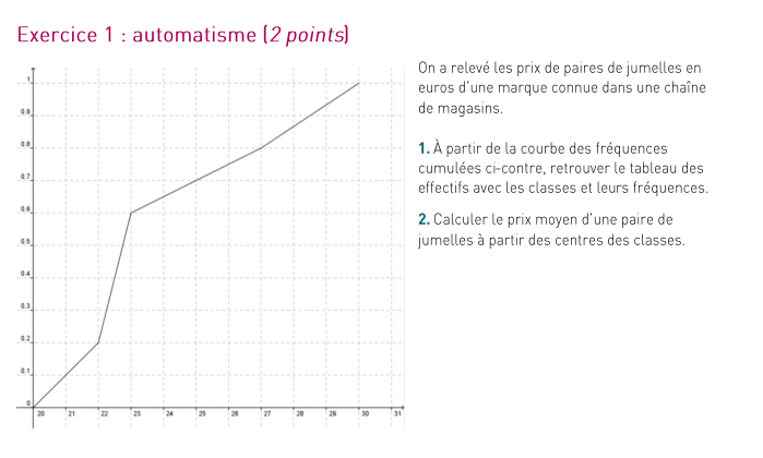 E-Bahut PAVE Posté(e) le 11 mai 2020 E-Bahut Signaler Posté(e) le 11 mai 2020 Sur l'axe des abscisses, tu as les prix qui vont de 20 à 30. On pourrait reprocher à celui qui a rédigé cet exercice de ne pas avoir donné l'unité de prix (en euros ?) et surtout de ne pas avoir à l'extrémité de chaque axe, inscrit la grandeur représentée !! ? Sur l'axe des ordonnées, la graduation va de 0 à 1. Y sont portées les fréquences cumulées croissantes. Tu peux observer qu'à l'abscisse 0 correspond une fréquence cumulée croissante (FCC) de 0 donc qu'aucun des prix relevés n'est inférieur à 20 euros ! A l'autre extrémité, tu as le point de coordonnées x = 30 et y = 1 : donc quand on "arrive" au prix de 30 € (non compris), la FCC est égale à 1 donc que 100% des prix observés sont (strictement) inférieurs à 30 €) J'ai considéré que l'on change de classe à chaque changement de direction de la courbe des FCC ... Tu observeras que 60% des prix relevés sont inférieurs à 23 € !! Vois tu cela ? Complètes le tableau que je te joins sous ce graphique.