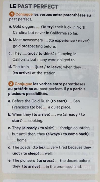 E-Bahut Jean B Posté(e) le 11 mai 2020 E-Bahut Signaler Posté(e) le 11 mai 2020 Bonsoir, Rappels utiles : 1) Le past perfect se compose de l'auxiliaire was ou were (selon le nombre du sujet, singulier ou pluriel) + le participe passé du verbe. Il sert à exprimer l'antériorité d'une action passée sur une autre action passée. Exactement comme en français tu emploies le plus-que-parfait et le passé simple. Ex. Lorsqu'il arriva (passé simple) chez lui, les pompiers avaient éteint (plus-que-parfait) l'incendie. Tu piges ? 2) a. prétérit au 2 verbes b. prétérit puis past perfect c. past perfect au 2 verbes d. prétérit puis past perfect e. past perfect puis prétérit