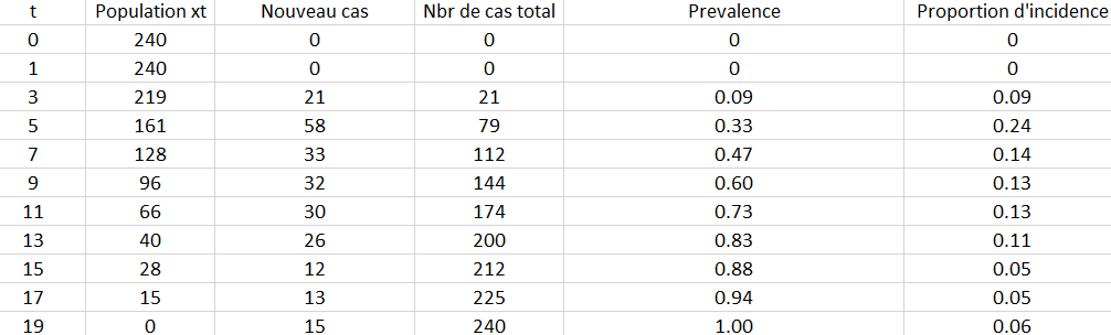 Uriel Posté(e) le 12 mai 2020 Signaler Posté(e) le 12 mai 2020 Bonsoir,j'éprouve certains doutes et difficultés sur les réponses d'un exercice car on a pas encore fait cette partie du cours :/.Si possible, je souhaiterais recevoir de l'aide afin de vérifier si je n'ai pas fait n'importe quoi et m'aider pour la question que je ne comprends pas s'il vous plaît.Énoncé :On étudie un échantillon de 240 individus atteints d'un cancer mortel mais dont un traitement prolonge la durée de vie. Le nombre d'individus survivants au terme de la durée t exprimé en mois est donné par la table suivante: Réponses: Représenter graphiquement:a) Prévalence au cours du temps de la cohorteb) Proportion d'incidence au cours du temps de la cohortec) Taux d'incidence au cours du temps de la cohorted) Densité empirique discrète de la durée de vie (Diagramme à barre)e) Densité empirique de la durée de vie (Histogramme)Réponse:Ici je ne mettrai que les valeurs de mes calculs sans graphique, ça sera ainsi plus simple pour voir si j'ai fait des erreurs.a) Prévalence = Nbr de cas total observé / Population totale (Malade non mort + Malade mort)b) Proportion d'incidence = Nbr de nouveau cas apparus pdt [t,t+Δt[ / Nbr de personnes dans la population à risque de produire des nouveau cas pdt [t,t+Δt[c) Taux d'incidence = Proportion d'incidence / Personne-année à risqueIci je ne sais pas comment faire car le temps est en mois et non en année et je ne trouve rien sur internet.d/e) Ici je ne sais pas de quel densité on parle. Après mes recherches, je pense que c'est la densité d'incidence. Mais sur certaines sources j'ai lues que le taux d'incidence corresponds à la densité d'incidence :/ … Je remercie en avance celles et ceux qui prendront le temps de bien vouloir m'aider.