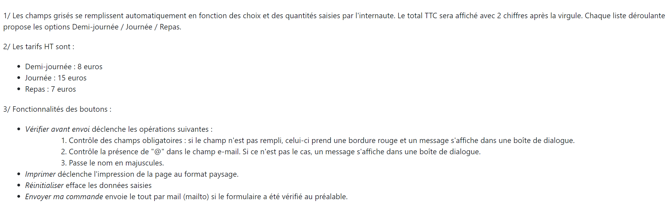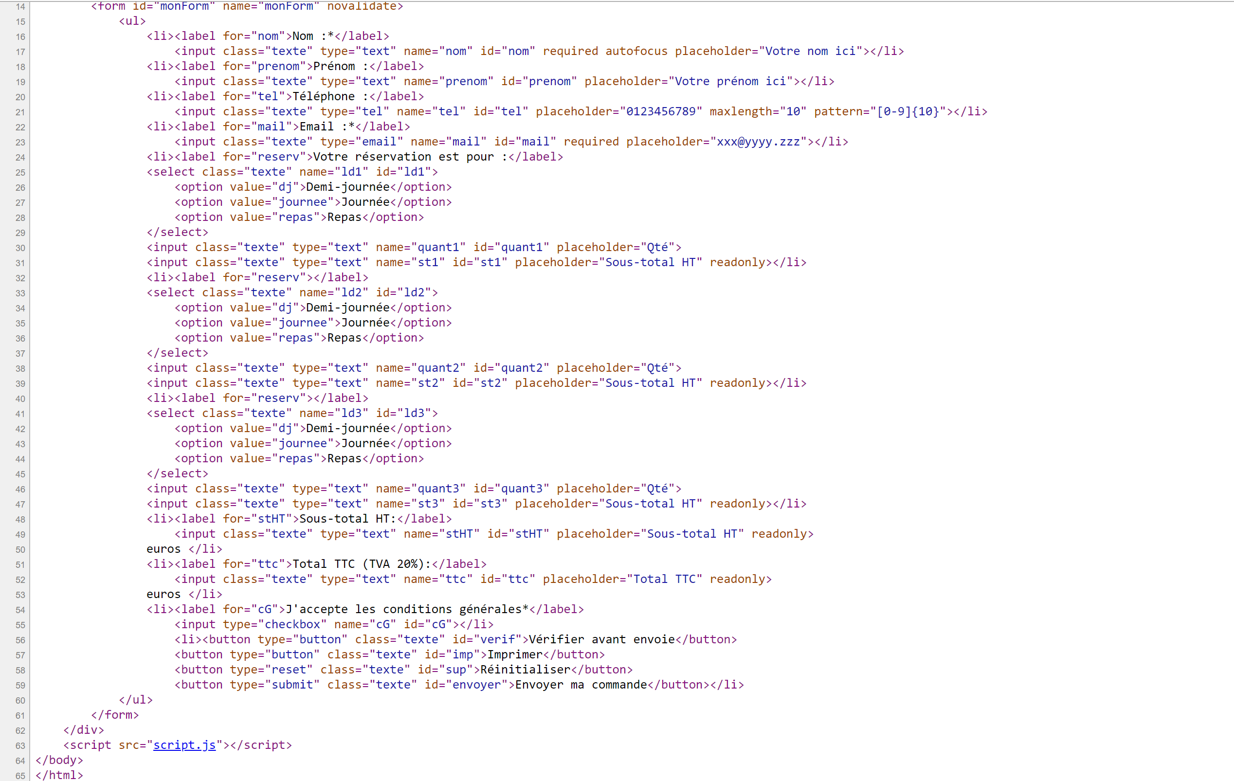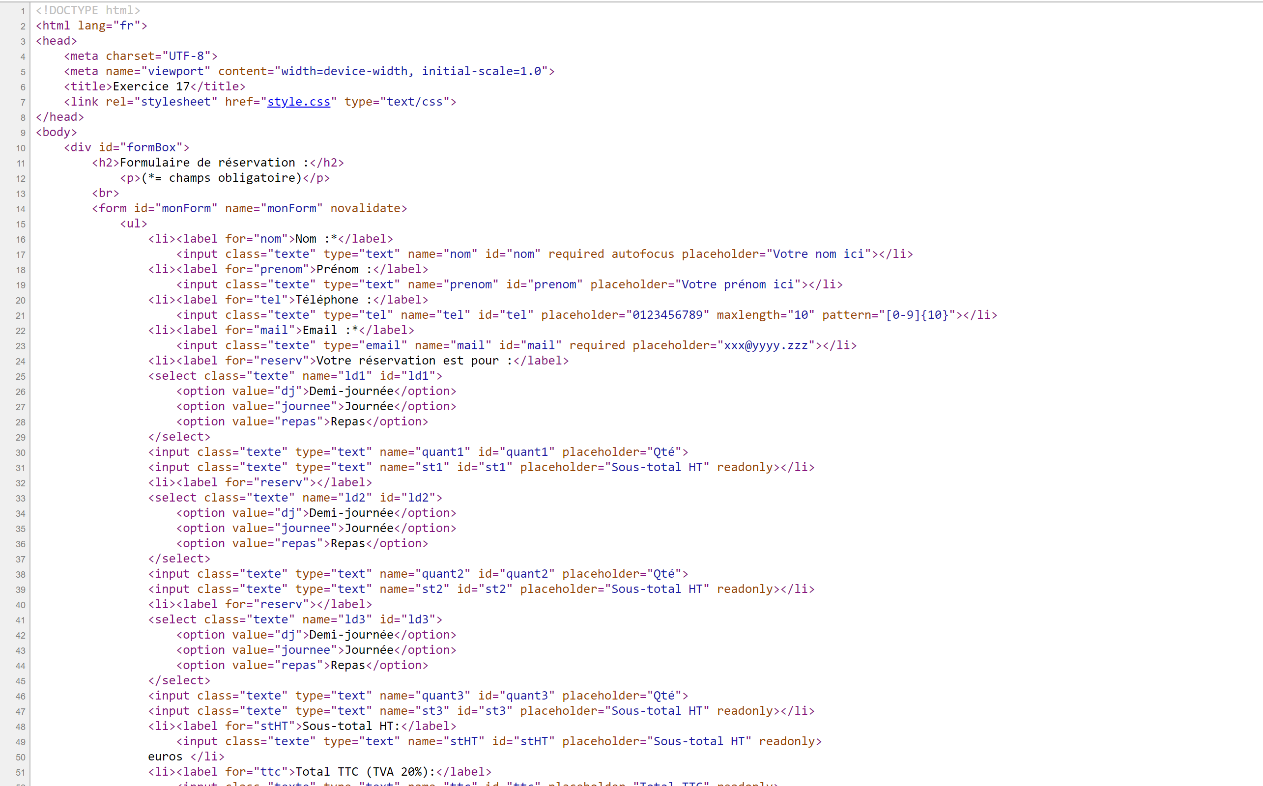Jess25 Posté(e) le 13 mai 2020 Signaler Posté(e) le 13 mai 2020 Bonjour, J'aurai besoin d'aide sur un exercice concernant un formulaire de réservation que je dois coder en HTML CSS et JavaScript. J'ai déjà fait la partie HTML et CSS, seulement j'ai des difficultés sur la partie JavaScript. Malgré mes nombreuses tentatives de recherches dans mes cours et sur internet, je ne sais pas quelles sont les méthodes pour pouvoir réaliser cette exercice correctement. Je vous montre mes captures d'écran de l'énoncé, de ma partie HTML et CSS. Merci à ceux qui prendront le temps de me répondre.