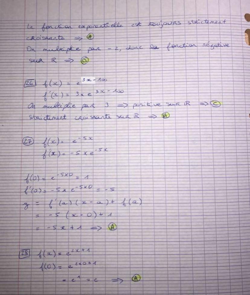 anylor Posté(e) le 18 mai 2020 Signaler Posté(e) le 18 mai 2020 bonjour il faut d'abord que tu apprennes les propriétés de la fonction exponentielle ( ton cours) pour 17) tu dérives x *e(x) en utilisant la formule (uv)' =u'v+uv' 18) tu simplifies en te servant des propriétés de e(x) pour 27) tu calcules l'équation de la tangente en 0 y =f(0) + f'(0) (x) Essaie de faire les questions que tu peux ( en te servant du cours ) on t'aidera à compléter où tu bloques...