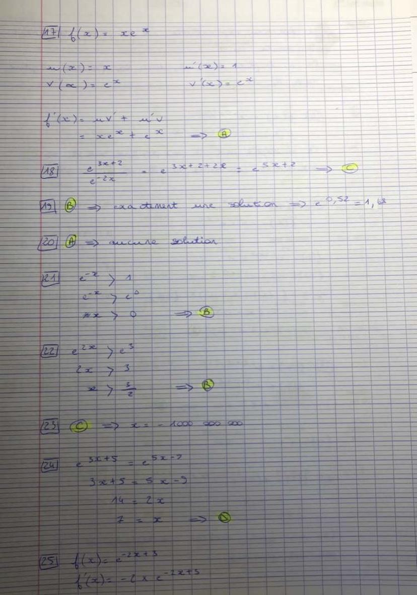 Nxmrtnzzzz Posté(e) le 18 mai 2020 Auteur Signaler Posté(e) le 18 mai 2020 Il y a 1 heure, anylor a dit : bonjour il faut d'abord que tu apprennes les propriétés de la fonction exponentielle ( ton cours) pour 1) tu dérives x *e(x) en utilisant la formule (uv)' =u'v+uv' 2) tu simplifies en te servant des propriétés de e(x) Essaie de faire les questions que tu peux ( en te servant du cours ) on t'aidera à compléter où tu bloques... Je trouve sa es que mes reponses son juste et esque j’ai pris toutes les reponses ou j’en est oublier?