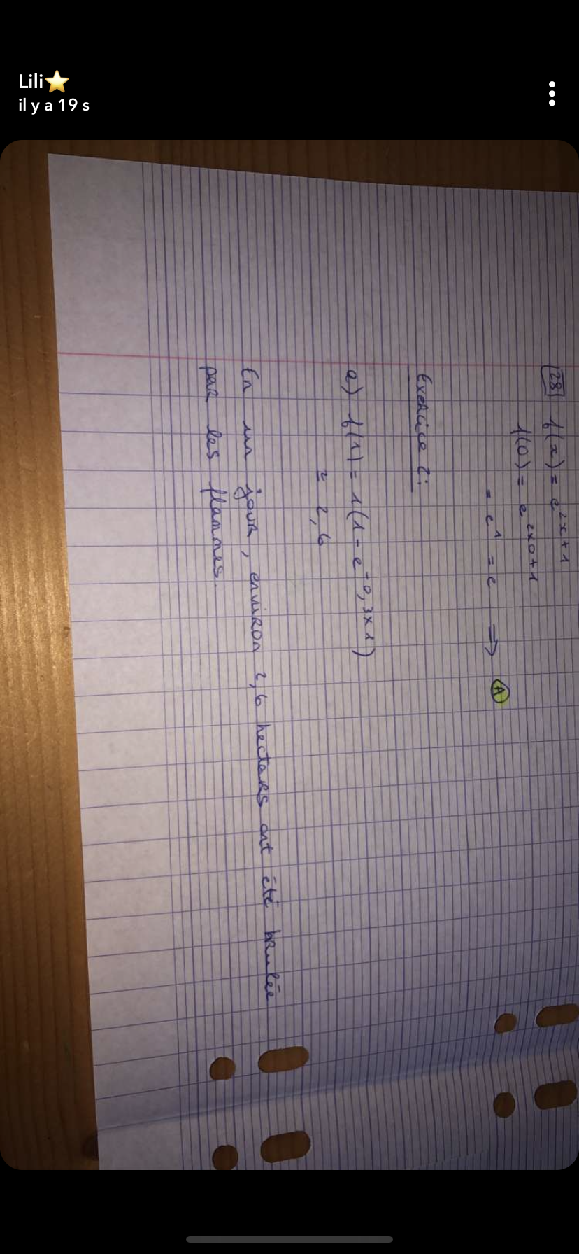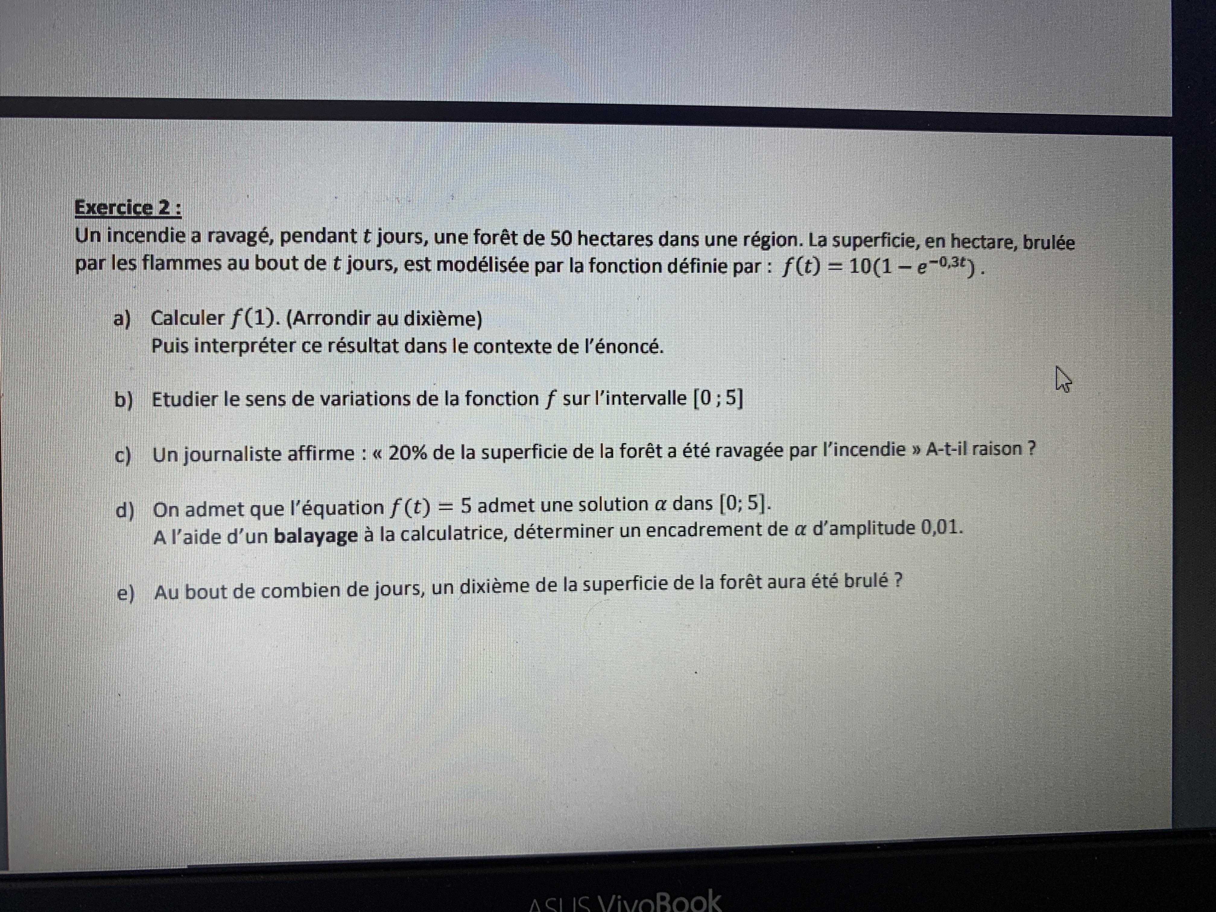 Nxmrtnzzzz Posté(e) le 19 mai 2020 Auteur Signaler Posté(e) le 19 mai 2020 il y a 24 minutes, julesx a dit : a) OK b) Ta démarche est bien compliquée ! 10*(1-e-0,3t)=10-10*e-0,3t dont la dérivée est simplement -10*(-0,3)*e-0,3t=10*e-0,3t . Il s'ensuit que la dérivée f'(t) est toujours positive, donc que f(t) est croissante. c) Si c'est au bout de 5 jours, le journaliste a, de toute façon, tort. Mais, même si on attend assez longtemps, la surface brulée aura bien du mal à atteindre les 10 hectares car f(t) ne tend vers 10 que lorsque t tend vers l'infini. d) OK e) Vu la formulation de la question, je pense qu'on attend un nombre entier, donc 3 jours. D’accord donc pour la b je doit changer quoi