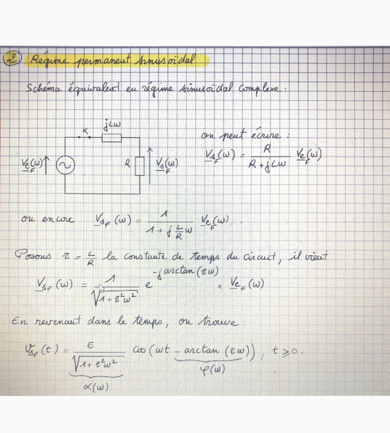 E-Bahut julesx Posté(e) le 20 mai 2020 E-Bahut Signaler Posté(e) le 20 mai 2020 On prend le module des des membres de l'égalité en nombres complexes. ||Vsf(ω)||->Vsf(ω) ||Vef(ω)-||>Vef(ω) Avec τ=L/R, 1/(1+jLω/R)=1/(1+jτω) et ||1/(1+jτω)||=1/√[1+(τω)²] OK ?