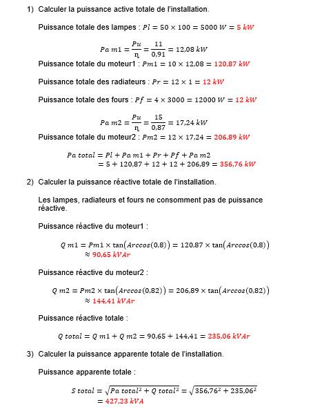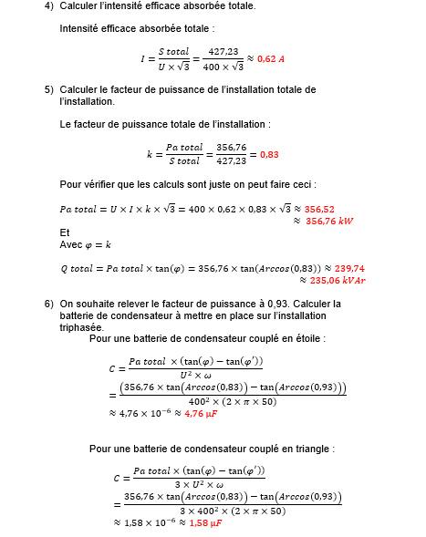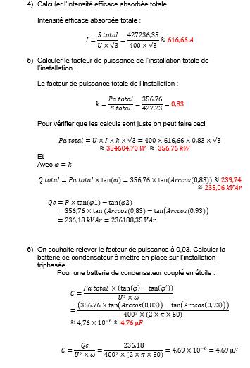 E-Bahut julesx Posté(e) le 24 mai 2020 E-Bahut Signaler Posté(e) le 24 mai 2020 Bonjour, 4) I est faux d'un coefficient 1000 car tu as gardé S en kVA. 6) A revoir car, de même, tu as gardé P en kW. En plus, il y a une erreur dans tes numérateurs, ton P n'est multiplié que par la première tangente, revois tes parenthèses. N.B. : Tu gardes systématiquement 2 chiffres après la virgule, mais c'est un peu incohérent car d'un côté tu as 5 chiffres au total, de l'autre 2 chiffres.