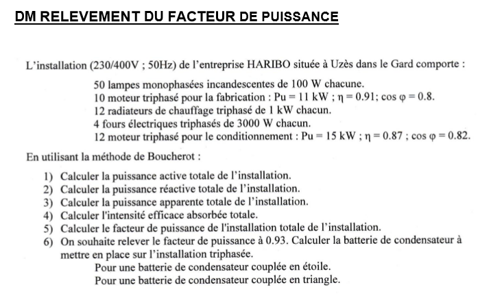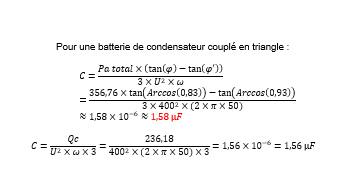 olafelix Posté(e) le 24 mai 2020 Auteur Signaler Posté(e) le 24 mai 2020 Bonjour, Je te remercie pour ta réponse et aussi beaucoup pour tes conseils. J'ai détaillé mes calculs pour la Puissance réactive à compenser (Qc) après je mets 2 chiffres après la virgule car notre prof nous demande souvent de donner 1 ou 2 chiffres après la virgule. Après pourquoi je dois mettre tout en W, est ce une convention (règle)? Je comprends pas trop. Il me semble que cela ne change rien pour les résultats finaux sauf qu'au lieu que je trouve les résultats en µF je les trouve en mF, à moins que je me trompe.... merci de ton éclairage et corrections à faire ,à nouveau si nécessaire car j'ai modifié le I et refais les calculs QC. Comme c'est un triphasé , dois je bien mettre X3 en dessous de la division pour calculer C dans le couplage en triangle? Un grand merci
