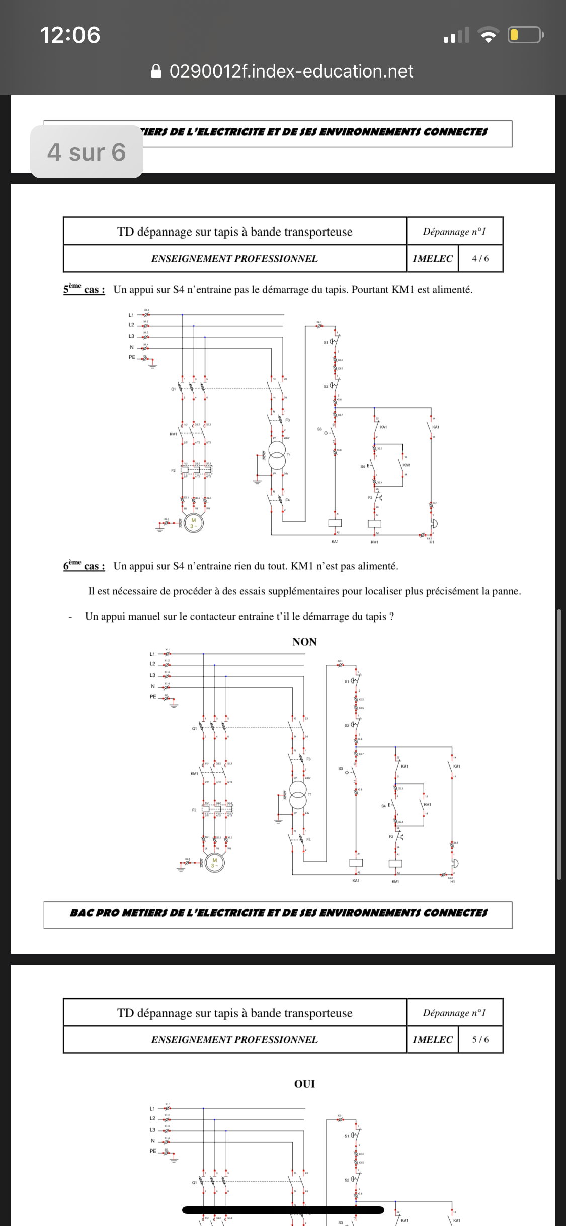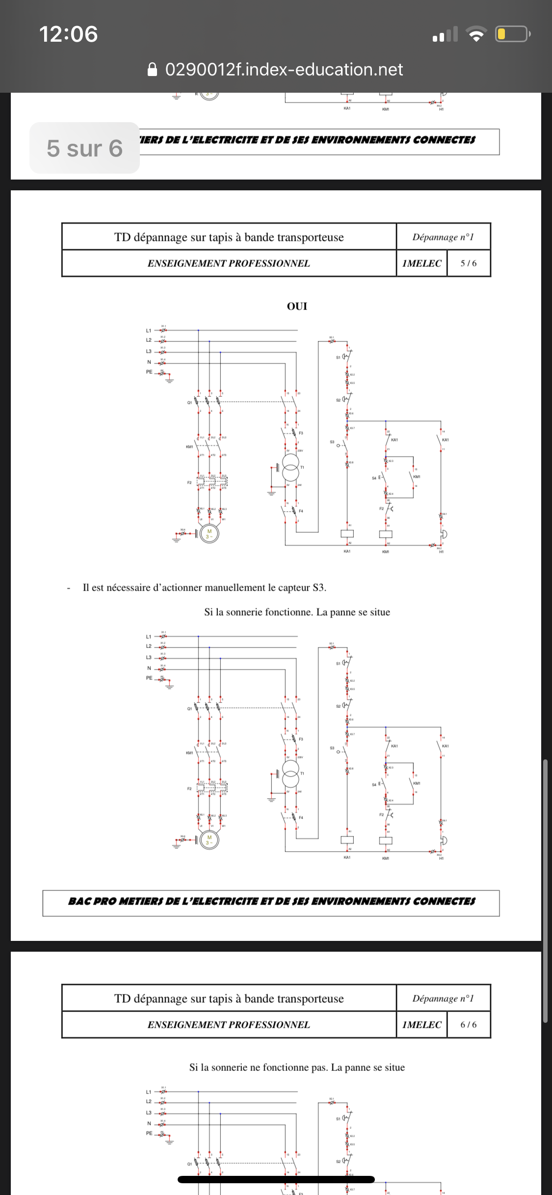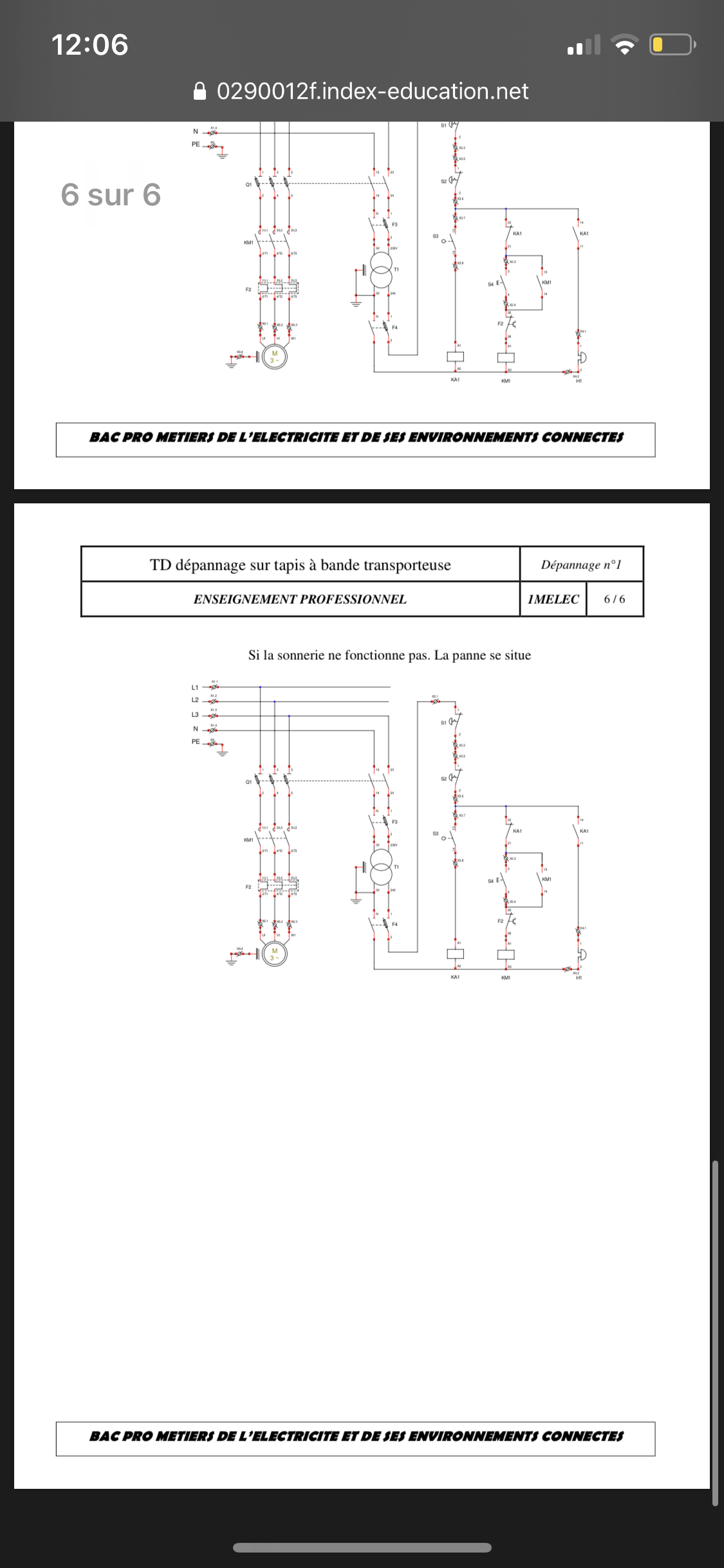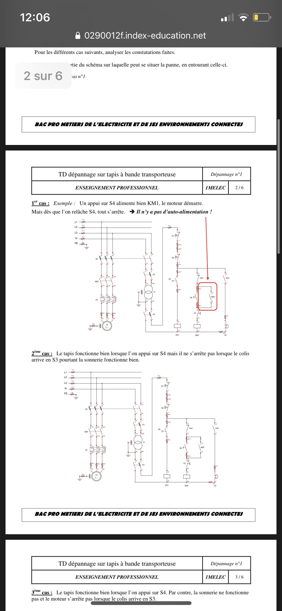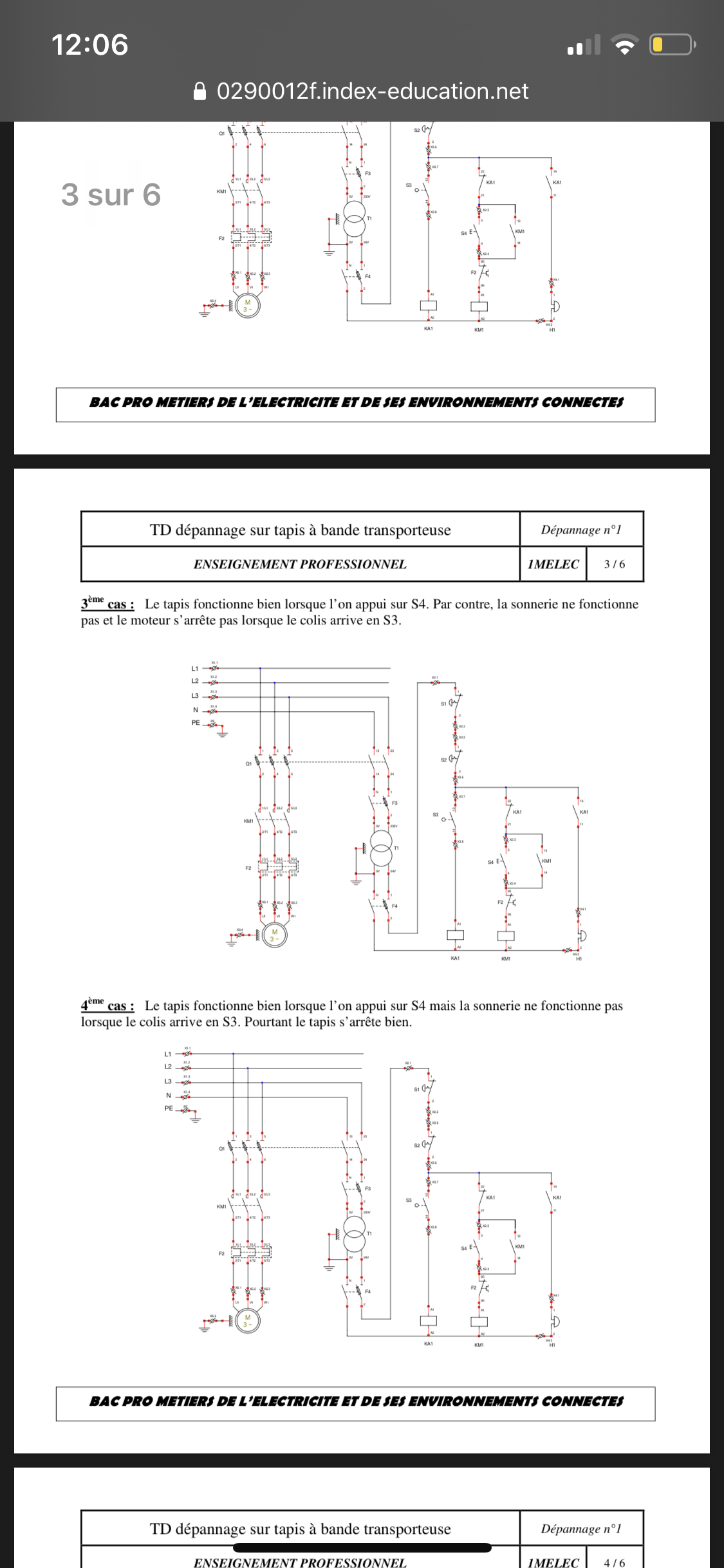 E-Bahut Denis CAMUS Posté(e) le 29 mai 2020 E-Bahut Signaler Posté(e) le 29 mai 2020 Bonjour, Les schémas ne permettent pas de voir les n° de façon sure. Trop petits. 1) Si le moteur démarre après appui sur S4, c'est que KM1 colle. S'il n'y a pas d'auto alimentation de KM1, voir le contact NO KM1 13-14 (pas sûr des n°). 2) Si ça sonne, KA1 colle. L'arrêt du moteur devrait se faire par NF KA1 21-22. 3) Si le moteur démarre, c'est que la connexion au dessus de S3 est alimentée. Voir à partir de S3 jusqu'au relais KA1 compris. 4) Voir KA1 13-14 et la sonnerie. 5) Contacts de KM1 sur l 'alimentation du moteur puisque toute la branche verticale au-dessus de KM1 est alimentée. 6) a) Voir Q1 ? (sans certitude). 6) b) S1 ? S2 ? KA1 ? S4 ? F2 ? Relais ? 6) c) KA1 ? S4 ? F2 ? Relais ? 6) d) S1 ? S2 ?