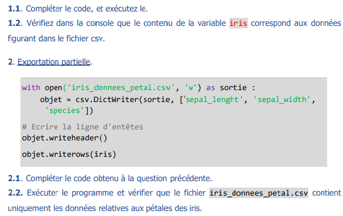E-Bahut julesx Posté(e) le 3 juin 2020 E-Bahut Signaler Posté(e) le 3 juin 2020 Bonsoir, Comme dit, je regarderai, mais sans garantie d'un résultat à 100%. D'après 1), il faut compléter le "return" par return {'sepal_length' : float(dico['sepal_length']), 'sepal_width' : float(dico['sepal_width']), 'petal_length' : float(dico['petal_length']), 'petal_width' : float(dico['petal_width'])} pour avoir l'ensemble demandé dans "isis". D'après 2), je n'ai pas trouvé d'autre possibilité pour n'avoir que les éléments demandés que de modifier la première partie en ne gardant que les éléments utiles : return {'petal_length' : float(dico['petal_length']), 'petal_width' : float(dico['petal_width'])} Partant de là, le script devient with open('iris_donnees_petal.csv','w') as sortie : objet=csv.DictWriter(sortie,['petal_length','petal_width']) objet.writeheader() objet.writerows(iris) J'ai essayé, ça "marche", sauf qu'avec un logiciel comme LibreOffice, il y a une ligne vide entre chaque ligne de données lorsqu'on ouvre le .csv correspondant. Mais tu t'y connais mieux que moi, je débute en Python (je ne pense d'ailleurs pas que je deviendrai un grand spécialiste, vu mon age ! ). Au plaisir de lire tes commentaires et tes rectification! Bonsoir.