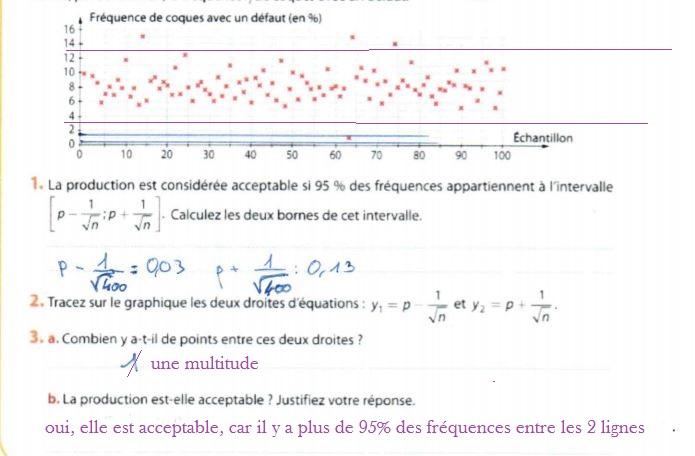 anylor Posté(e) le 4 juin 2020 Signaler Posté(e) le 4 juin 2020 bonjour activité 1 question 2)c) fréquence d'apparition de la brique 2 = 0,139 fréquence d'apparition d'une brique quelconque = 0,143 0,139 < 0,143 donc la brique 2 apparaît moins souvent feuille 2 nuage de points ton intervalle est Ok [0,03 ; 0,13] mais tes droites sont fausses car sur le graphique , l'axe des ordonnées est en % donc , la droite doit être tracé à 3 et 13 tu vois que cette fois ci , il n'y a pas qu'1 point, mais une multitude. pour 11) et 12) les résultats doivent être donnés à 10 -2 près revois racine carrée de n feuille 3 ok