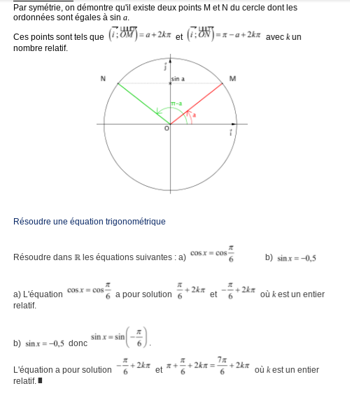 anylor Posté(e) le 16 juin 2020 Signaler Posté(e) le 16 juin 2020 bonjour tu n'as pas à faire cet exercice, tu as l'énoncé et au-dessous les solutions de l'équation. il faut juste que tu apprennes la méthode. a) c'est une équation basique si cos x = cos pi/6 => réponse x = pi/6 + 2kpi ou x = - pi/6 + 2kpi dans R avec k appartenant à Z (entier relatif) il faut que tu apprennes par cœur les valeurs trigonométriques remarquables ( à moins que tu ne les connaisses déjà ) méthode à savoir par coeur :