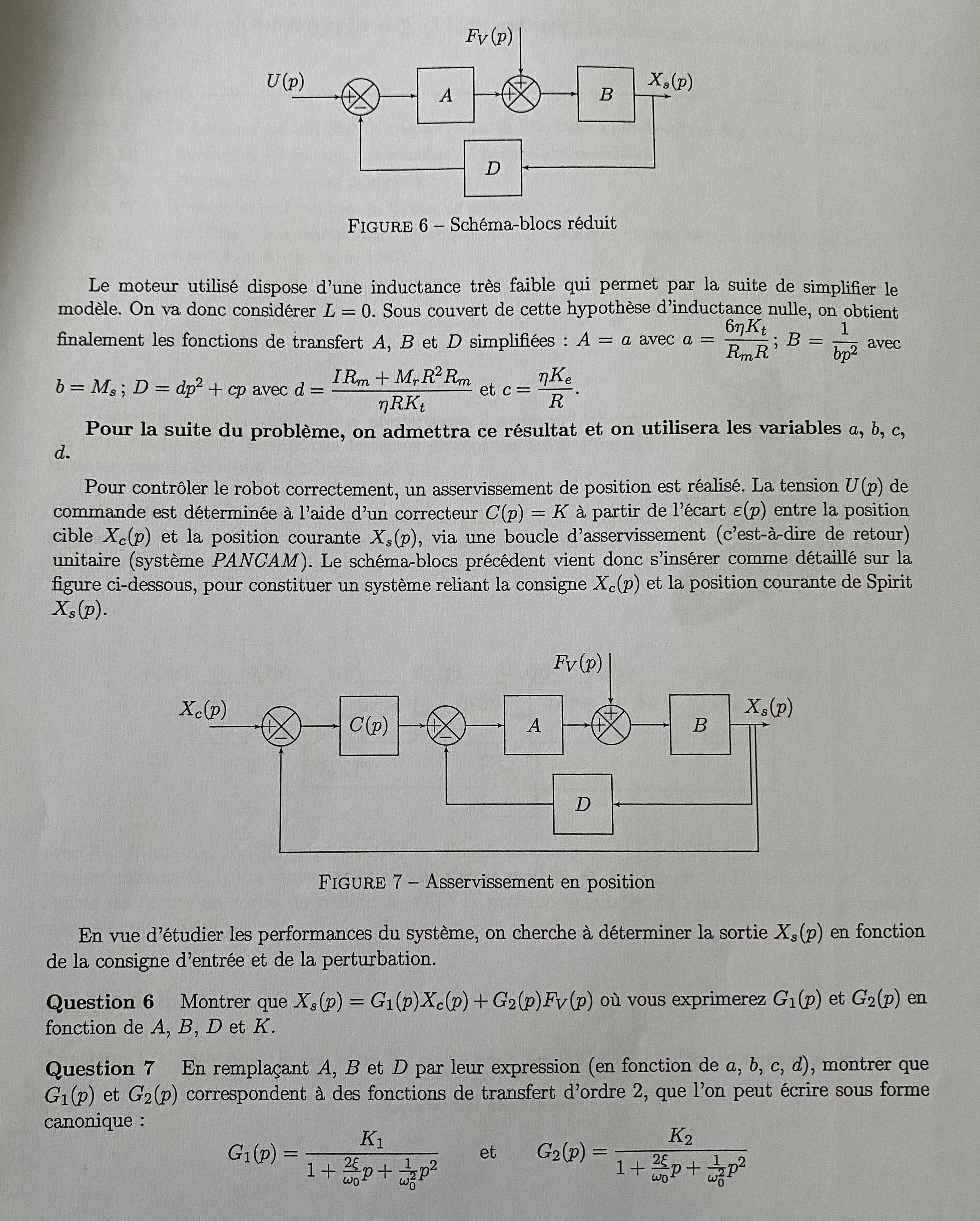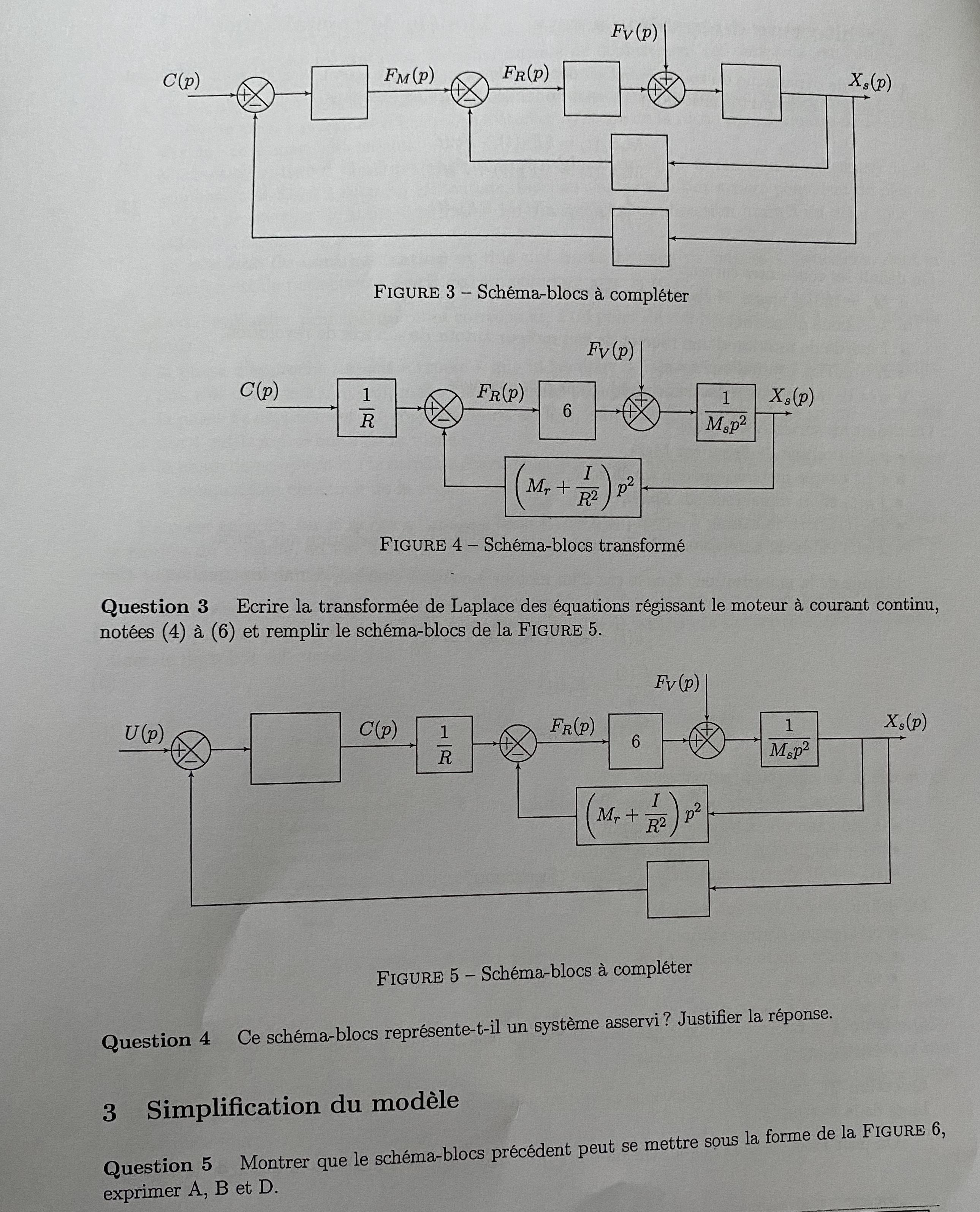 E-Bahut julesx Posté(e) le 1 septembre 2020 E-Bahut Signaler Posté(e) le 1 septembre 2020 Bonsoir, Un peu d'aide pour le début. 1) Transformées de Laplace : (1) Ms*p²*Xs(p)=6*Fr(p)+Fv(p) (2) Mr*p²*X(p)=-Fr(p+Fm(p) (3) I/R*p²*X(p)=C(p)-R*Fm(p) suppose que x'(0)=0 et x"(0)=0 (voir propriétés de la transformée de Laplace). 2) Pour remplir les rectangles, il faut simplement ré-écrire les équations en faisant apparaitre les sorties des comparateurs en fonction des entrées (1) Ms*p²*Xs(p)=6*Fr(p)+Fv(p) => Xs(p)=1/(Ms*p²)*[6*Fr(p)+Fv(p)] (2) Mr*p²*X(p)=-Fr(p+Fm(p) => Fr(p)=Fm(p)- Mr*p²*X(p (3) I/R*p2*X(p)=C(p)-R*Fm(p) => Fm(p)=1/R*[C(p)-I/R*p²*Xs(p)] Pour ce soir, ce sera tout, complète la figure 3 avec ces éléments et poste la réponse. N.B.: Si un autre intervenant veut prendre le relais, qu'il n'hésite pas.