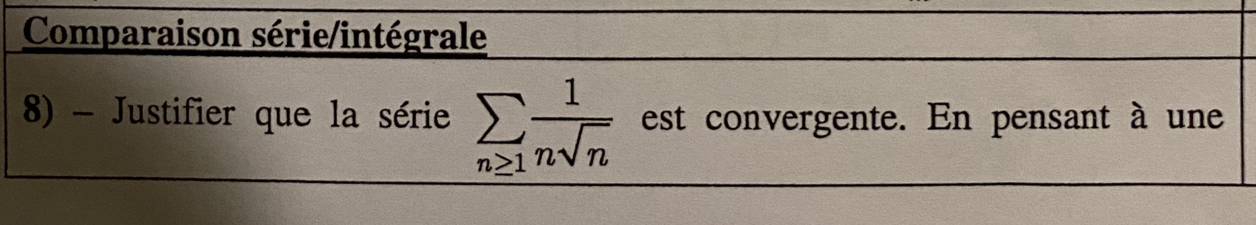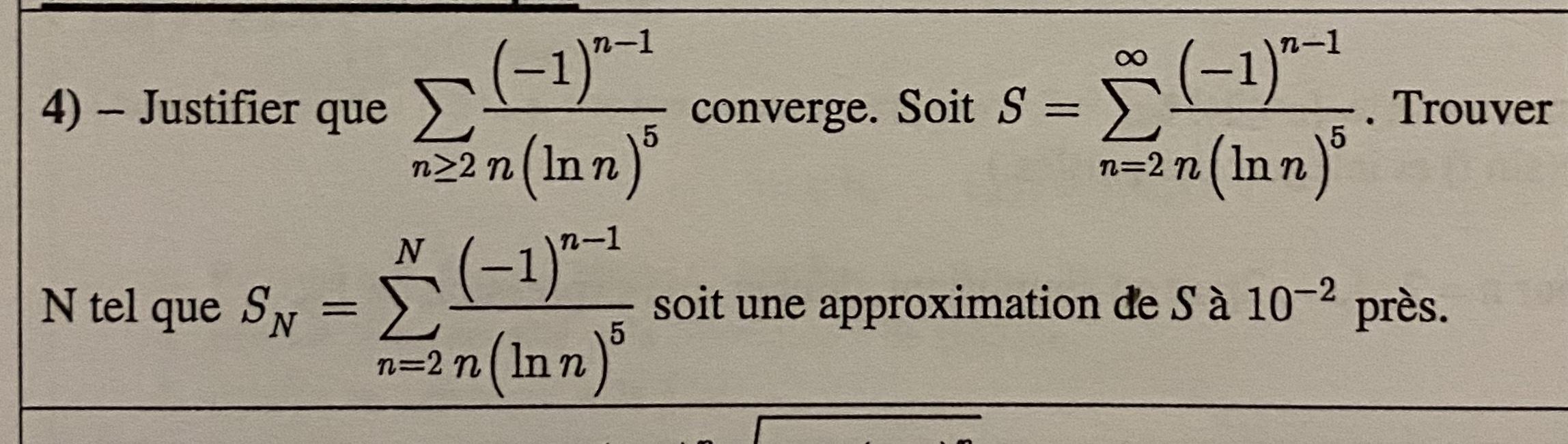 Black Jack Posté(e) le 17 septembre 2020 Signaler Posté(e) le 17 septembre 2020 4 suite) Théorème de Leibniz ... Comme on est dans le cas correspondant au théorème de Leibniz, l'erreur faite en négligeant les termes de la série à partir d'un certain rang est inférieure ou égale en valeur absolue au 1er terme négligé. Il faut donc trouver le rang du terme à partir duquel on peut arrêter (pour avoir la précision désirée). 1/(n.(ln(n))^5) 10^-2 n.(ln(n))^5 100 n 6 ---> on peut négliger le 6ème terme ... et les suivants. SN = Somme (de n = 2 à 5) (-1)^(n-1)/(n.(ln(n))^5) à moins de 10^-2 près. SN = -1/(2*ln^5(2)) + 1/(3*ln^5(3)) - 1/(4*ln^5(4)) + 1/(5*ln^5(5)) à moins de 10^-2 près SN = -2,947 à moins de 10^-2 près par défaut (à cause du signe du 1er terme négligé)