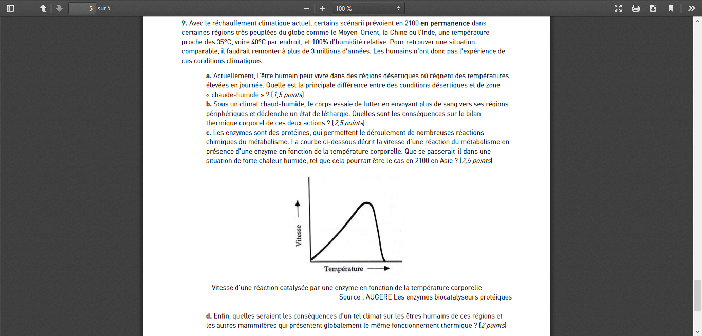 loulou34212 Posté(e) le 18 septembre 2020 Auteur Signaler Posté(e) le 18 septembre 2020 Il y a 13 heures, anylor a dit : bonjour qu'as tu commencé à faire ? a) caractéristiques d'une région désertique ? caractéristiques d'une région chaude et humide ? b) pose toi la question : "pourquoi le corps envoie plus de sang vers ses extrémités ..." pour le a) j'ai mis : quantité d'humidité b) c) la vitesse de réaction aurait augmenter d)