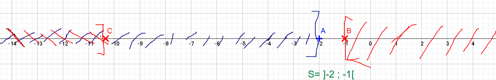E-Bahut PAVE Posté(e) le 21 septembre 2020 E-Bahut Signaler Posté(e) le 21 septembre 2020 "Merci beaucoup à vous tous je pense que je suis un cas désespéré(e)." Bien sûr que non ? Laura. Ces histoires d'équations et d'inéquations irrationnelles ne sont pas forcément évidentes ! Demande à tes copains copines, ce qu'ils en pensent As tu compris que la démonstration de Black Jack que tu cites ci dessus, a une SUITE que tu trouveras dans son message d'hier à 12h 42. Le 20/09/2020 à 12:42, Black Jack a dit : x + 13 > 2.sqrt((x+10)(x+5))... pour x > -2 car Va*Vb = V(ab) Avec x > - 2 (condition d'existence des racines carrées) ... cette contrainte x>-2 , on la "traine" depuis le départ Les 2 membres de l'inéquation sont positifs et donc on peut élever au carré sans modifier le sens de l'inéquation, on obtient alors : On applique une nouvelle fois la propriété 0<A<B => A²<B² pour "se débarrasser" des racines carrées. (x + 13)² > (2.sqrt((x+10)(x+5)))² ... toujours pour x > -2 x² + 13² + 26x > 4.(x+10)(x+5) les racines carrées ont "disparues" x² + 169 + 26x > 4.(x²+15x+50) x² + 169 + 26x > 4x²+60x+200 0 > 4x²+60x+200 - x² - 169 - 26x 0 > 3x² + 34x + 31 3x² + 34x + 31 < 0 Ouf !! sous contrainte que x soit un nombre >-2, l'équation initiale a le même ensemble de solutions que cette inéquation polynomiale du second degré. Voir cours de Première, pour résoudre cette inéquation polynomiale du second degré, il suffit de se souvenir du théorème qui donne le signe d'un trinôme du second degré ! Tu connais ? On cherche en calculant le discriminant b²-4ac, si 3x²+34x+31 admet des racines (NB Raccourci : la racine -1 est ... "évidente" !!!! donc l'autre vaut -c/a =-31/3). et on peut (facilement) montrer que 3x² + 34x + 31 = (x+1).(3x+31) --> (x+1).(3x+31) < 0 (avec toujours la contrainte que x > -2) le trinôme est négatif pour les valeurs de x comprises entre les racines -31/3 et -1 (tu appliques le théorème ou tu refais un tableau de signes) Si on récapitule les "contraintes" : x est solution de l'équation initiale si : x>-2 et -31/3<x<-1 soit graphiquement ... et ceci amène finalement : x compris dans ]-2 ; -1[ Mes excuses à Black Jack pour mes annotations complémentaires pour Laura ?