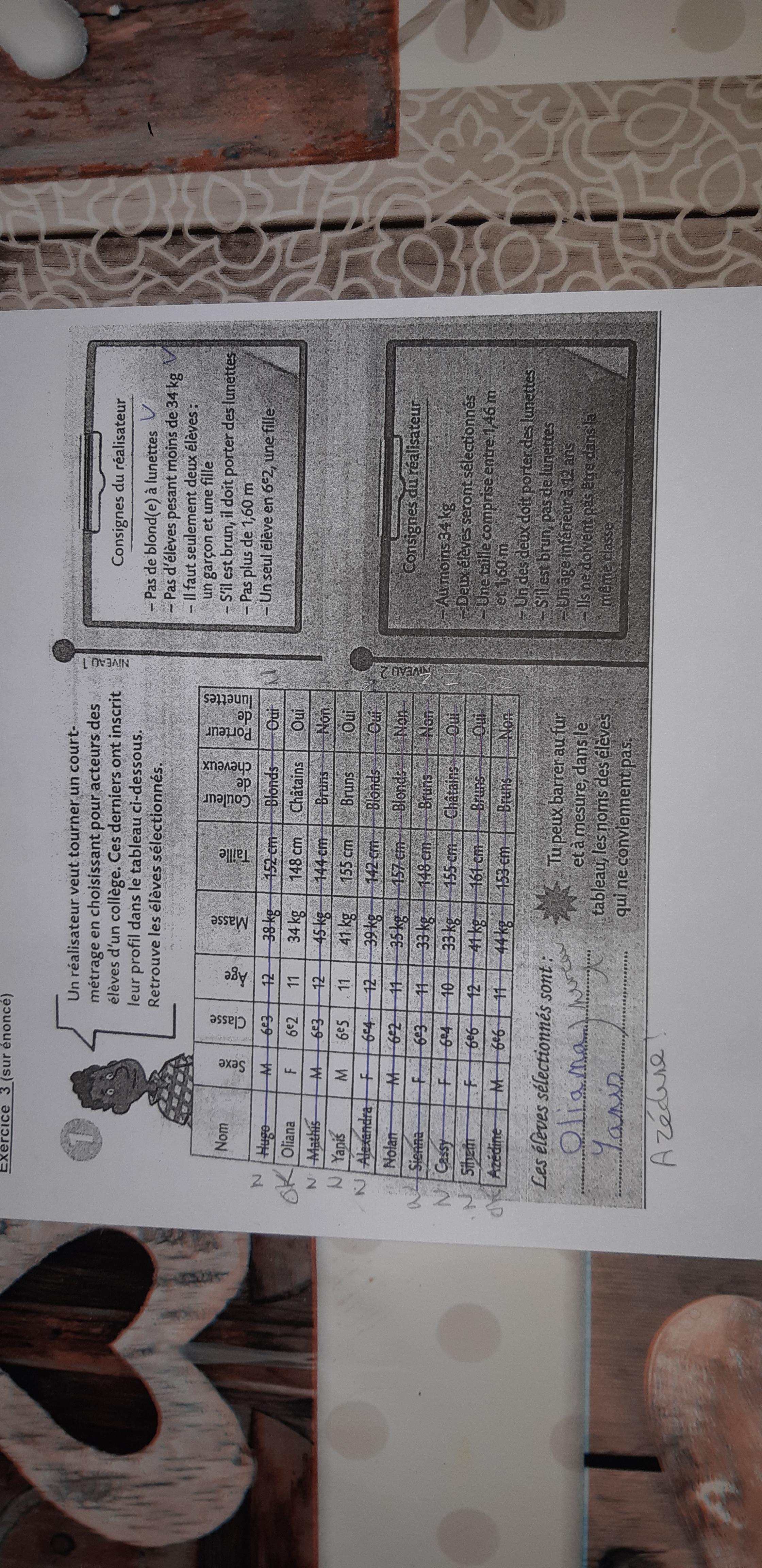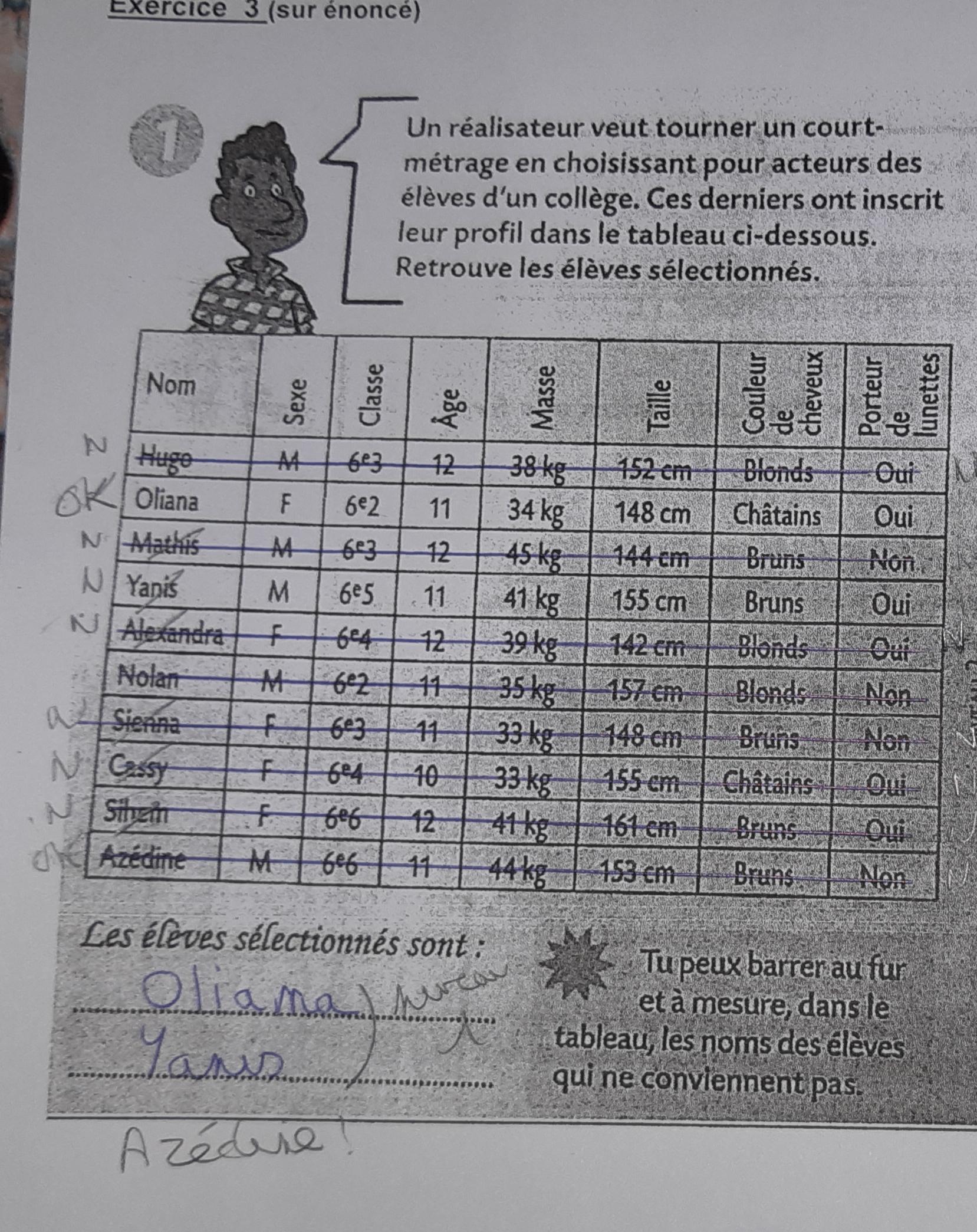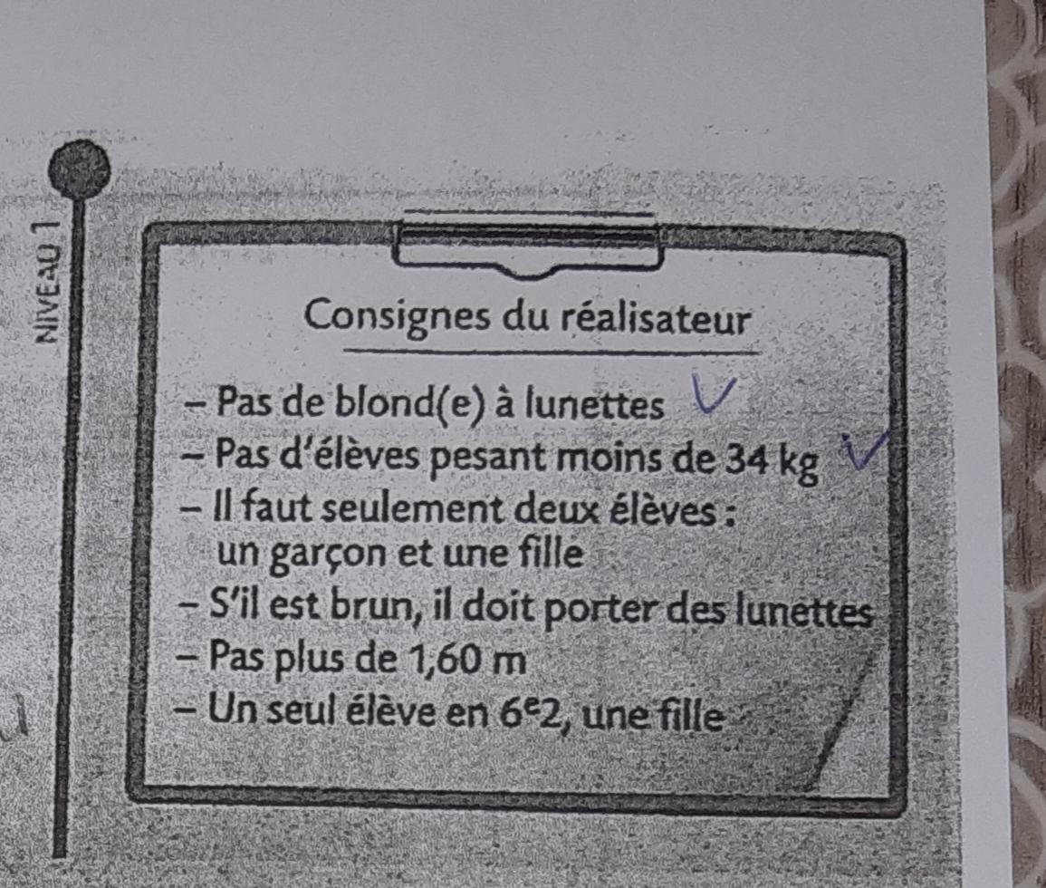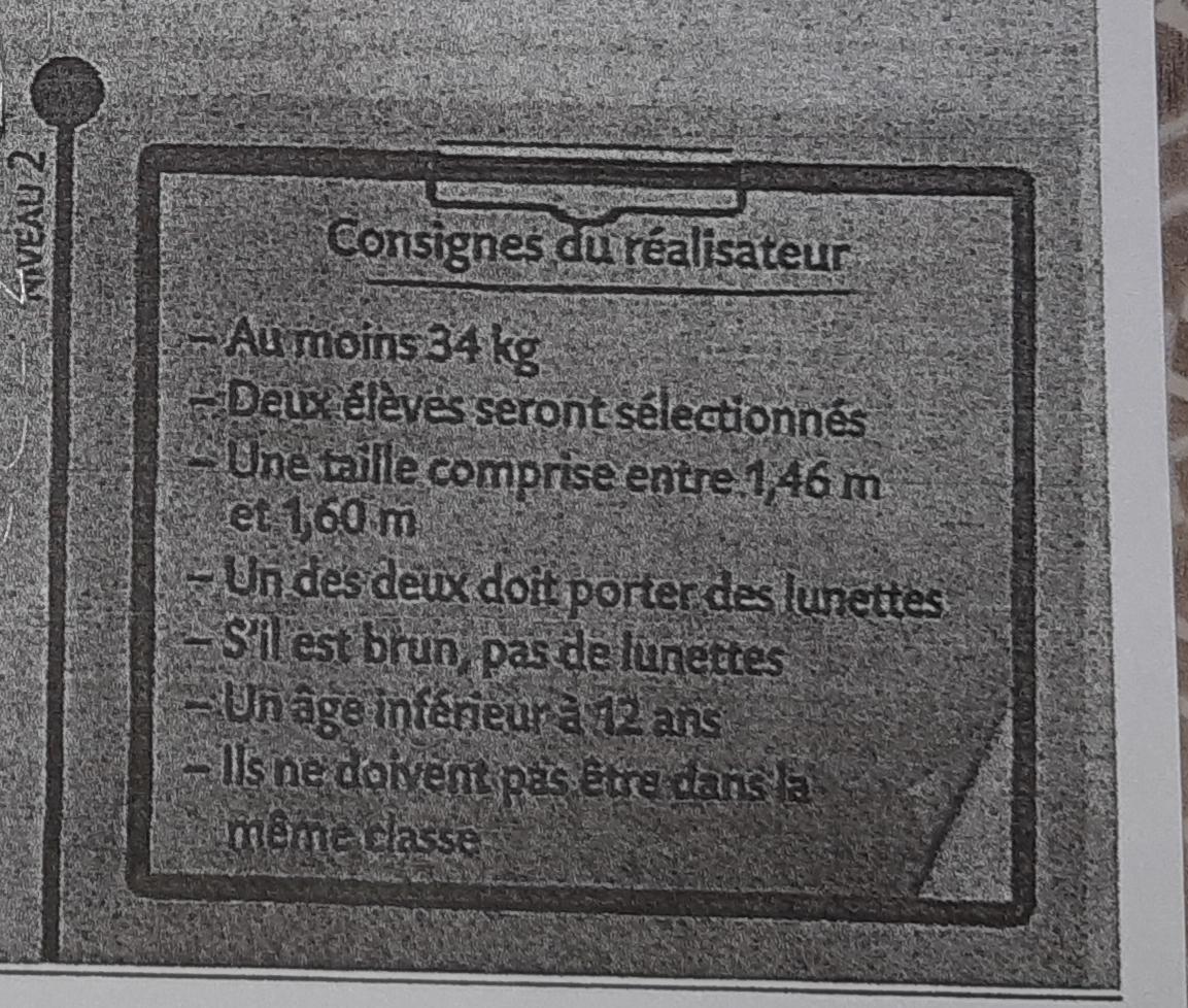 Virginied59 Posté(e) le 22 septembre 2020 Signaler Posté(e) le 22 septembre 2020 Bonjour, mon frère qui est en 6ème doit rendre un DNS en maths pour lundi. Pour l'exercice que je poste je ne sais pas l'aider. Quand je suis les consignes du rédacteur pour le niveau 1, les 2 élèves sélectionnés sont Oliana et Yanis mais quand je respecte les consignes du rédacteur pour le niveau 2, Yanis ne convient plus et Azédine semble être le bon choix avec toujours Oliana. Pouvez vous m'expliquer comment nous devons procéder s'il vous plaît. Merci d'avance