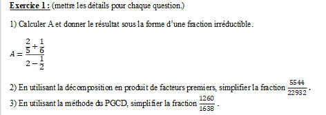 anylor Posté(e) le 26 septembre 2020 Signaler Posté(e) le 26 septembre 2020 bonjour pour t'aider à commencer exercice 1 tu fais les opérations en 2 fois numérateur =2/5 +1/6 en réduisant au m^me dénominateur =17/30 dénominateur 2-1/2 en réduisant au m^me dénominateur =3/2 pour diviser 2 fractions tu multiplies par l'inverse (17/30) / (3/2 ) = (17/30 )x (2/3 ) = après simplification par 2 = 17/45 pour l'exercice 2 tu décomposes en facteurs premiers en te servant des critères de disivibilité 5544 = 2 x 2 x 2 x 3 x 3 x 7 x 11 22932 = 2 x 2 x 3 x 3 x 7 x 91 ensuite tu simplifies il te reste : numérateur -> 2 x 11 dénominateur -> 91 soit ta fonction irréductible 22/ 91 3) tu cherches le PGCD à 1260 et 1638 je te laisse continuer