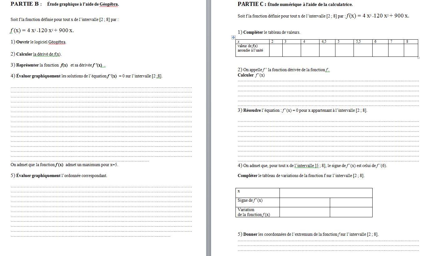 E-Bahut PAVE Posté(e) le 13 octobre 2020 E-Bahut Signaler Posté(e) le 13 octobre 2020 Bonjour Charline, Bien sûr que l'on peut t'aider (er !). Mais pour quelle question ? La 1) c'est plus que simple !! La 2) c'est de l'ultra classique : dérivée d'un polynôme. Quelle expression as -tu trouvée pour f '(x) ? La 3) c'est immédiat si tu sais un peu te servir de GEOGEBRA. Tu saisis les 2 fonctions et GEOGEBRA fait le boulot ! Cool ?. Envoie nous en pièce jointe, par exemple, le fichier GEOGEBRA (.ggb) qui contient les 2 courbes. Essaye car sur ce site joindre un fichier .ggb est facile. Si tu n'y arrives pas dis le nous. A toi de dire. DERNIERE MINUTE : je viens de voir que Pzorba vient de te donner la fonction dérivée : chance ! Pour le reste, je ne suis pas sûr que ce que l'on te demande consiste à calculer les racines de la fonction dérivée... je conçois plutôt une lecture graphique. Mais l'un n'empêche pas l'autre si tu as vu l'autre en cours.