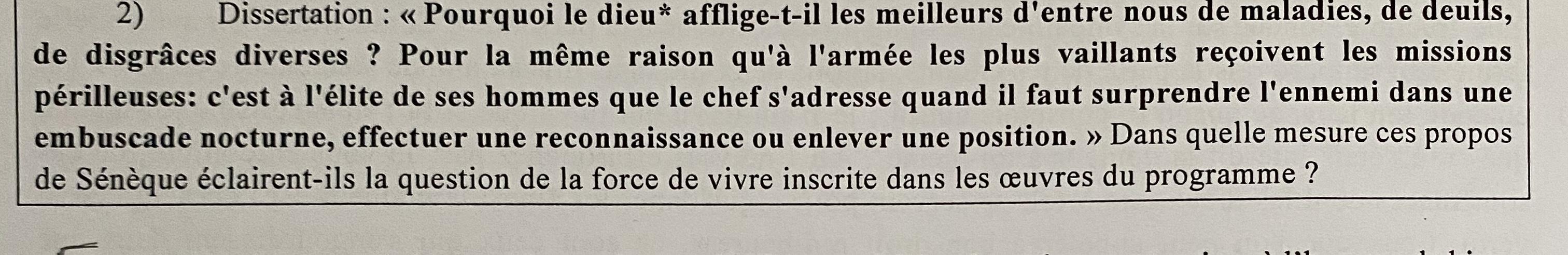 Nègrepierre Posté(e) le 30 octobre 2020 Signaler Posté(e) le 30 octobre 2020 As-tu bien compris les propos de Sénèque ? Une explication de ces propos me parait nécessaire pour traiter le sujet. Pour la suite, peux-tu nous dire ce que tu as retenu des oeuvres du programme en ce qui concerne la "force de vivre" qu'elles sont censées exprimer ?