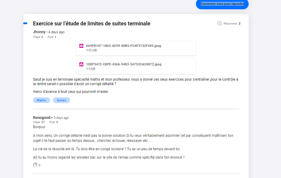 JeanP Posté(e) le 29 octobre 2020 Signaler Posté(e) le 29 octobre 2020 Il y a 11 heures, pzorba75 a dit : Tu confonds de l'aide et faire faire ton devoir à ta place. Si tu veux de l'aide, montre d'abord ce que tu as fait, en tapant comme ceux qui répondent et aident bénévolement. Après et seulement apprès, tu sera aidé. Il se peut que de temps en temps, quand il fait beau, que certains fassent ton travail, mais ce n'est pas une règle et cela ne te rendra pas service, en DST ou devant la copie du bac, tu devras bien travailler seul et être corrigé. Apprendre les maths, c'est chercher à résoudre des problèmes et rédiger les solutions, pas faire de la copie des solutions trouvées au hasard sur Internet ou dans des livres d'annales corrigées. ? Il y a 18 heures, Link0802 a dit : incroyable je ne suis pas le seul a demander de l'aide cependant je viens de voir aucune aide a été proposé sur ce sites ? Etonnant ! ça ressemble pourtant mot à mot à l'intitulé du fameux jhonny ? Il y a 18 heures, Link0802 a dit : incroyable je ne suis pas le seul a demander de l'aide cependant je viens de voir aucune aide a été proposé sur ce sites ?