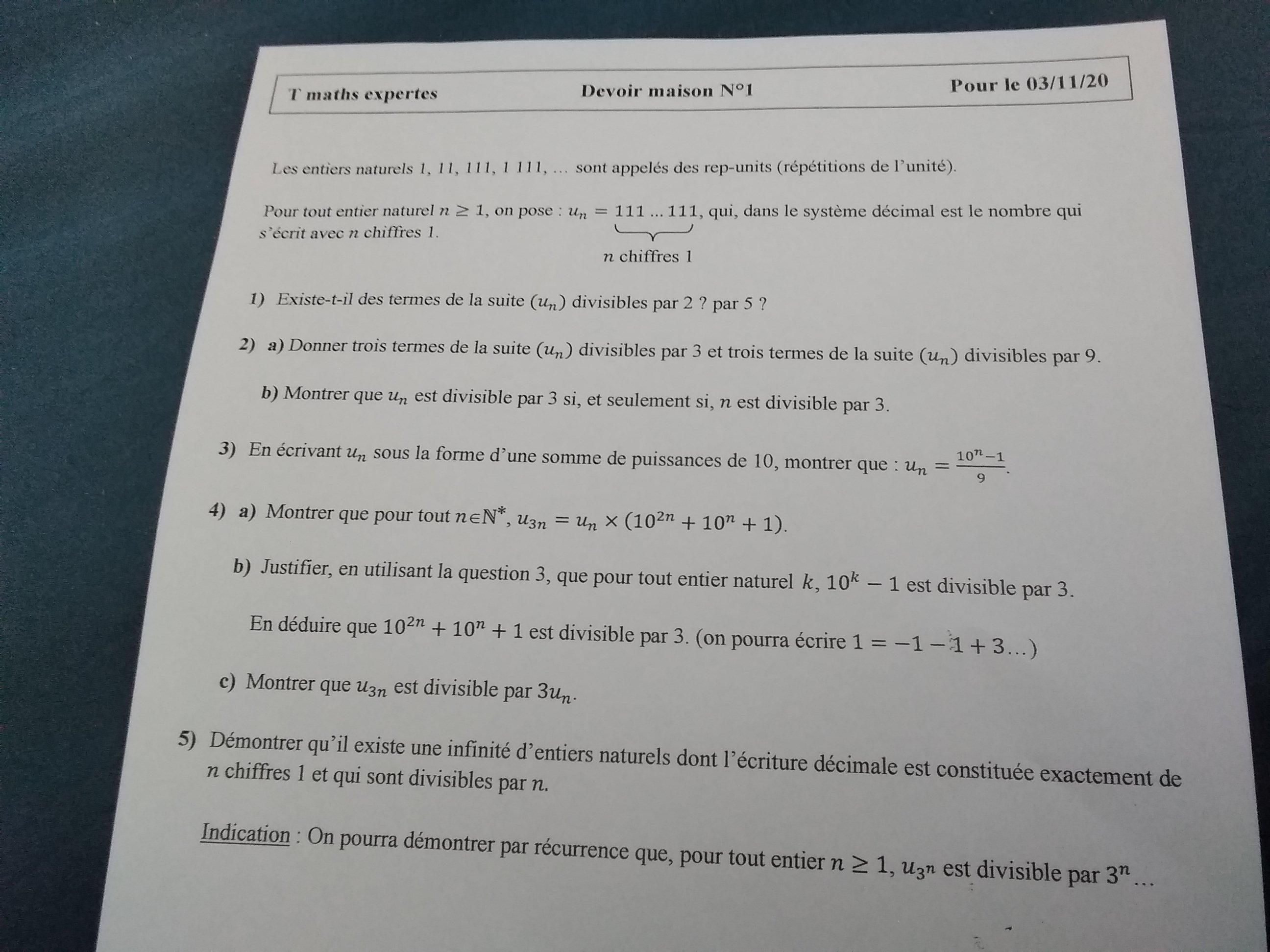 Nairod Posté(e) le 31 octobre 2020 Auteur Signaler Posté(e) le 31 octobre 2020 Il y a 20 heures, pzorba75 a dit : J'aide pour la question 1) Il n'y a pas de multiples de 2 ou 5 qui se terminent par 1, le reste dans la division par 2 est 1 et, dans la division par 5, 1 également. 2) pour la 2) un nombre décimal est divisible par 3 si le somme de chiffres qui le forment est divisible par 3, alors 111, 111000 et 111111 sont divisibles par 3, par exemple. Pour la suite j'attends de voir ton travail pour suivre. La question 1 je l avais trouvé et j ai trouver la 2b) aussi merci quand même Il y a 20 heures, julesx a dit : Bonjour et bienvenue sur le site, Un peu d'aide pour commencer. 3)b) Il suffit d'utiliser le critère de divisibilité par 3 : Un nombre est divisible par 3 si et seulement si la somme de ces chiffres est divisible par 3. Comme la somme des chiffres de un est égale à n, ... je te laisse conclure 4)a) Une possibilité : Partir de u3n=∑k=03n-110k Décomposer la somme en trois parties ∑k=03n-110k=∑k=2n3n-110k+∑k=n2n-110k+∑k=0n-110k ∑k=2n3n-110k=102n*∑k=0n-110k=102n*un ∑k=n2n-110k=10n*∑k=0n-110k=10n*un ∑k=0n-110k=un Il n'y a plus qu'à mettre un en facteur. Bonjour merci de votre réponse j'avais réussi a trouvé pour la 2)bmais pour la question 4)a je n ai pas encore vu cette écriture et je n' ai donc pas compris mais le 3n de U3n n est pas égal a (10**2n+10**n +1)?