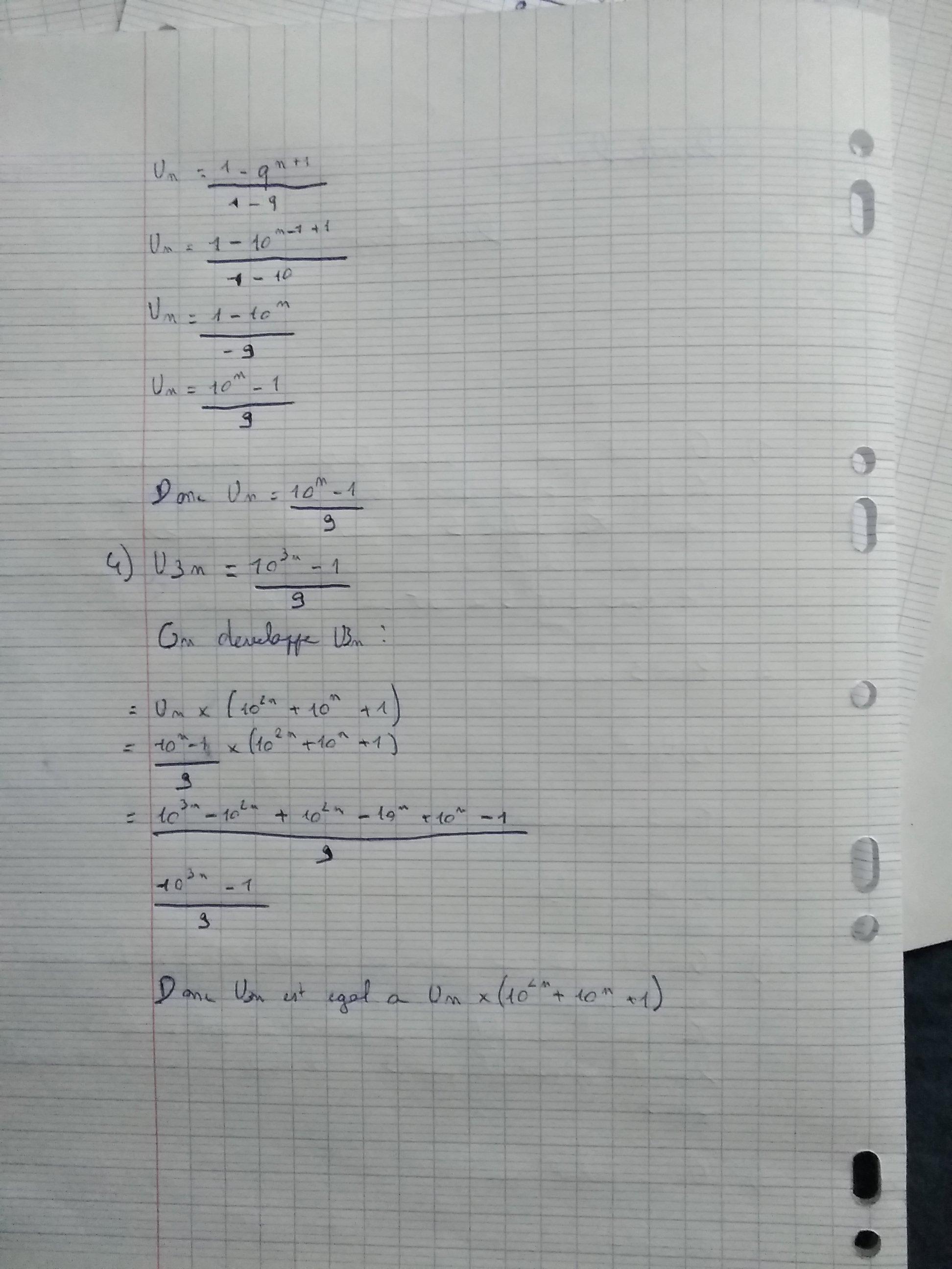 anylor Posté(e) le 31 octobre 2020 Signaler Posté(e) le 31 octobre 2020 bonjour pour la 4) À la question 3) tu as : Un = (10n -1) / 9 donc tu peux écrire : U3n = (103n -1 ) /9 tu développes Un (102n +10n +1) en remplaçant Un par sa valeur question 3) (10n -1) / 9 * (102n +10n +1) = 103n +102n +10n - ......................... tu compares les résultats et tu conclus