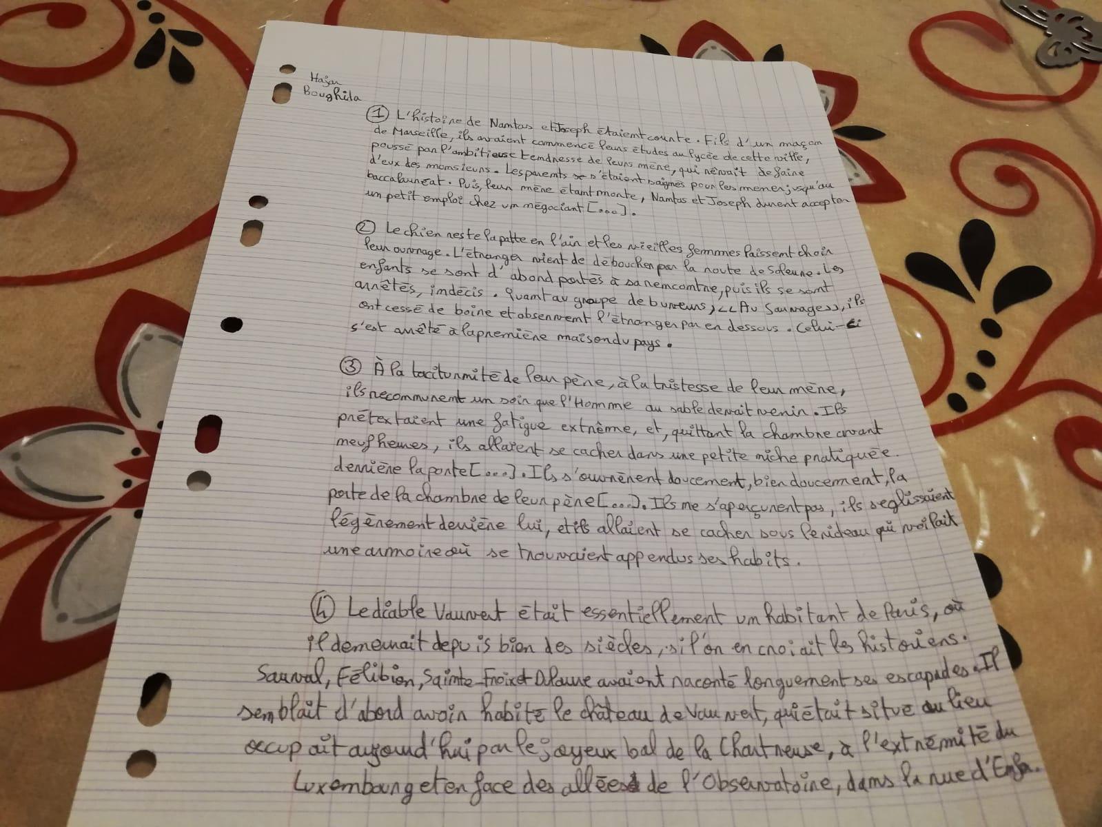 E-Bahut Jean B Posté(e) le 30 octobre 2020 E-Bahut Signaler Posté(e) le 30 octobre 2020 Bonsoir, 1 L'histoire de Nantas et Joseph était courte << le verbe au singulier car il n'y a qu'une histoire, elle leur est commune à tous les deux. poussés << au pluriel ... des messieurs << attention à l'orthographe du pluriel 2 C'est un sans faute, bravo. 3 Ils ouvrirent doucement... << révise la conjugaison de ce verbe Il ne nous aperçut pas... << Il n'y a qu'un seul père 4 ..., si l'on en croit les historiens.. << le temps ne change pas, c'est une vérité permanente => présent C'est un petit piège. ... leurs escapades << ils sont 4 à les raconter => accord du possessif au pluriel À l'avenir, passe tes réponses de préférence au scanner ou bien, si tu n'en es pas équipée, photographie tes réponses sur un fond uni. Bonne continuation