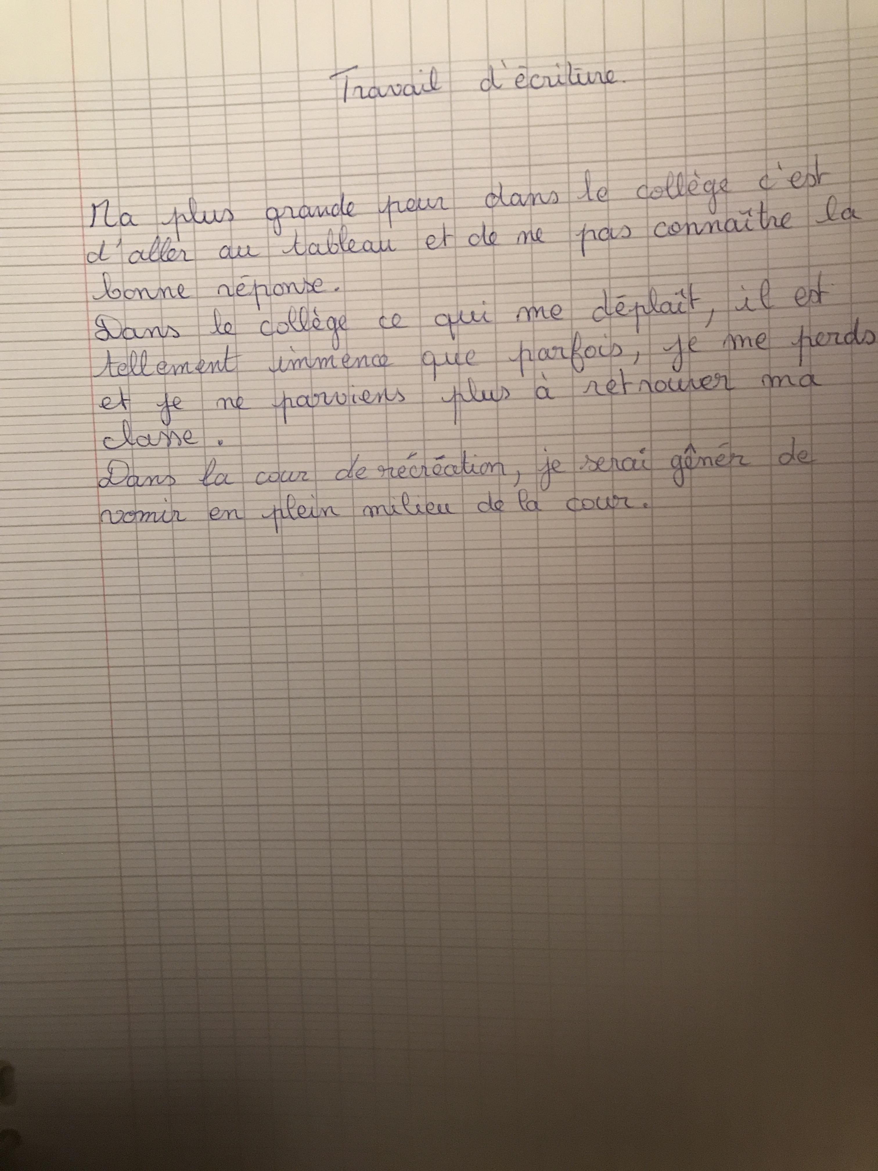 Aliciatis Posté(e) le 5 novembre 2020 Auteur Signaler Posté(e) le 5 novembre 2020 Voici Ma plus grande peur est de faire tomber mon plateau de self devant les collégiens . Je serai très gênée de vomir dans la cour devant tous les élèves . Dans le collège ce qui me déplaît c'est que l'intérieur est immense et du coup je me perds parfois . Mais il y a pas 10 lignes .