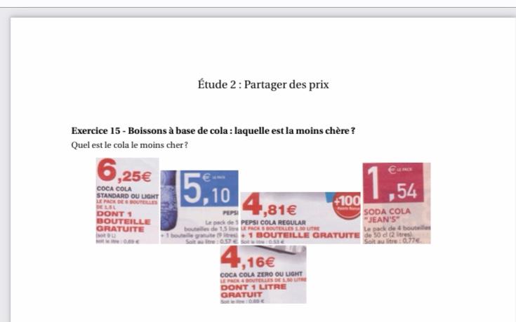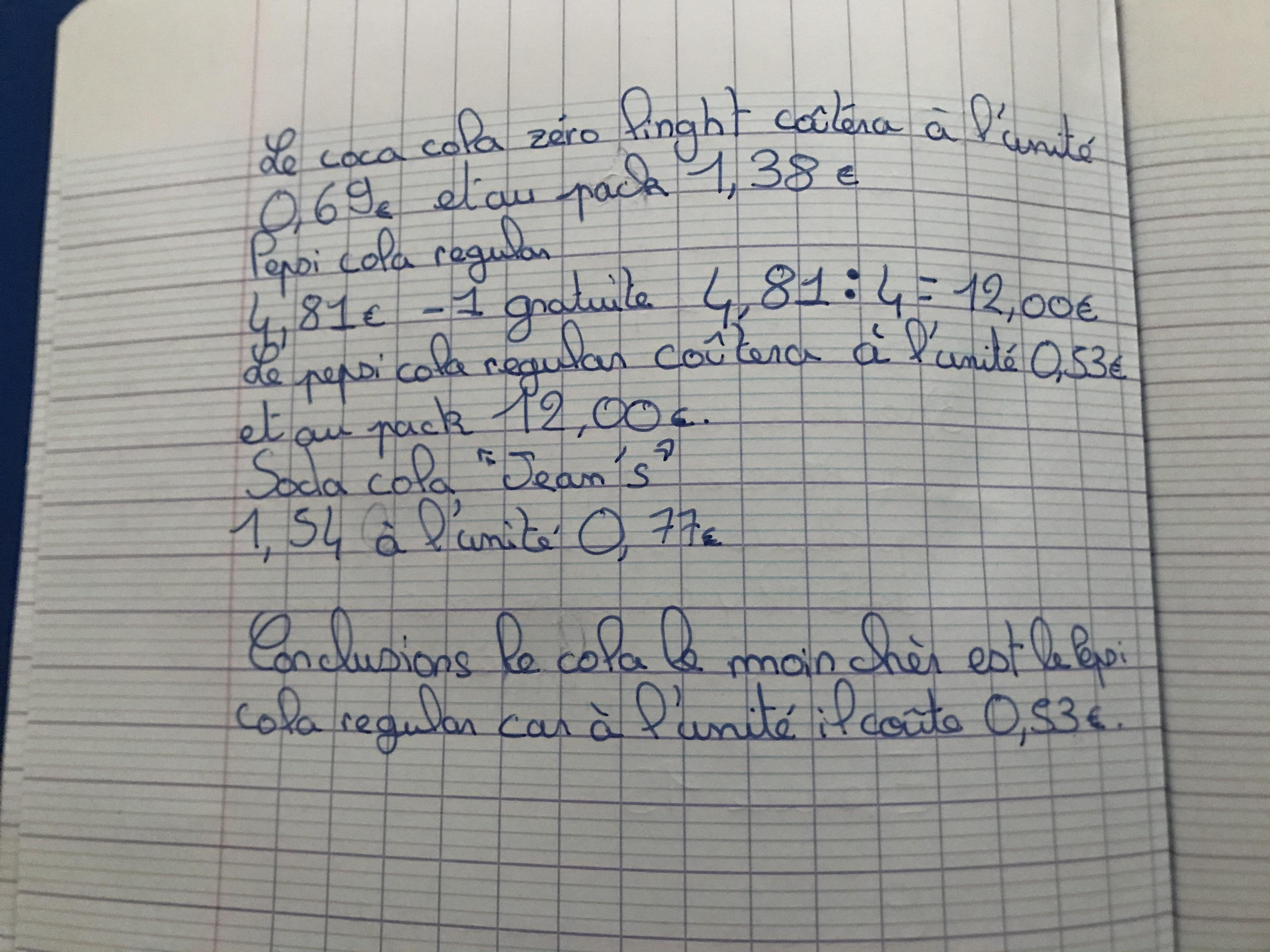 Aliciatis Posté(e) le 15 novembre 2020 Auteur Signaler Posté(e) le 15 novembre 2020 il y a 10 minutes, pzorba75 a dit : Pour comparer les prix, les industriels mettent le prix au litre quand ils produisent des liquides. Et les as du marketing font des prix pour des volumes différents, ce qui amène à retrouver le prix au litre en divisant le prix du lot par le nombre de litres. À toi de jouer. Voici mon exercice fait merci