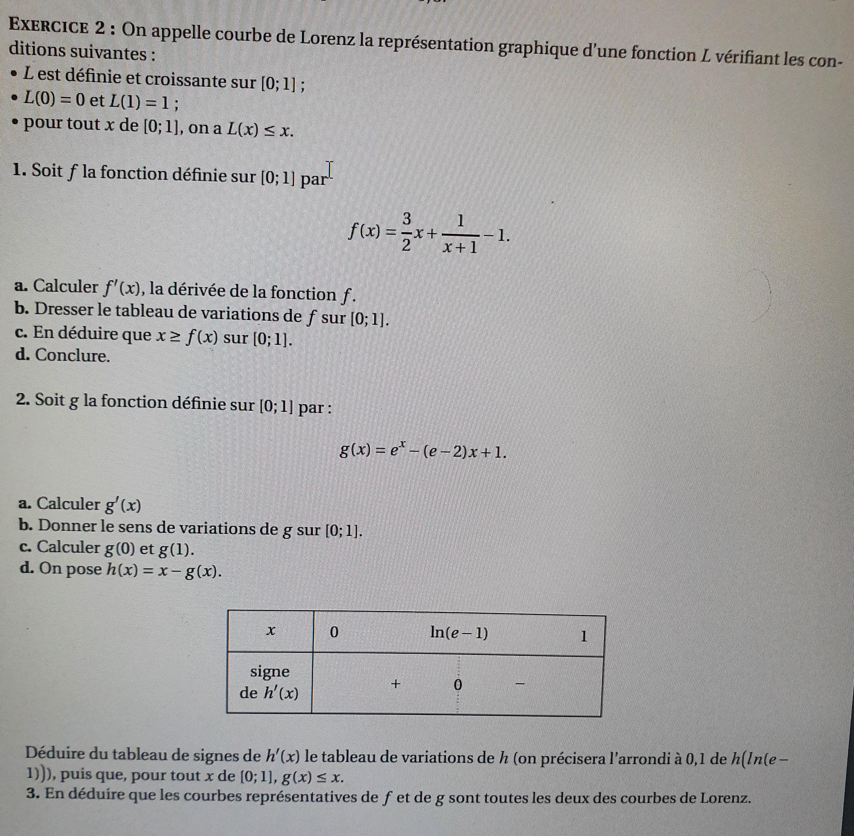 E-Bahut pzorba75 Posté(e) le 18 novembre 2020 E-Bahut Signaler Posté(e) le 18 novembre 2020 f'(x)=3/2-1/(x+1)^2=[3(x+1)^2-2]/(x+1)^2=(3x^2+6x+1)/(x+1)^2 sur [0;1] f'(x)>0 f croissante f(0)=0 et f(1)=1 Pour la suite tu étudies le signe de f(x)-x qui sera négatif. À toi de travailler.