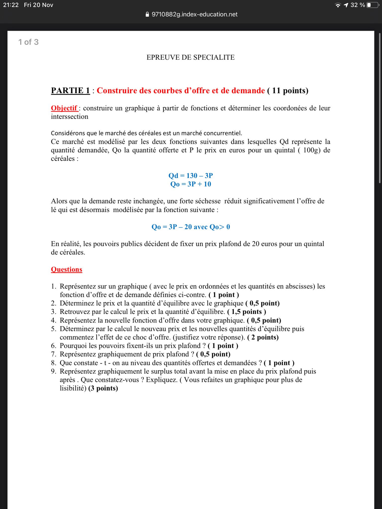 volcano47 Posté(e) le 21 novembre 2020 Signaler Posté(e) le 21 novembre 2020 1) Le texte (avec en prime des fautes d'orthographe) n'est pas très clair. On demande d'abord de tracer les deux premières fonctions affines Qd et Q0 , l'autre droite Q0 (ou plutôt Q'0 qui serait plus clair) n'intervient qu'en 4). Equilibre signifie, je suppose que offre = demande donc il faut chercher graphiquement l'intersection des deux droites et affiner ceci par le calcul : quel est le point tel que 130-3p =3p+10 ? 120 = 6p donne p = 20 et donc Q0 = Qd = 130- 60 (= 60 +10) = 70 quintaux pour 20 € Au point de vue maths, la suite ne va pas tellement plus loin , mais il est demandé de rédiger, d'utiliser de nouvelles données (Q'0) etc.. Si tu sais traiter l'intersection de deux droites du type y=ax+b, ça doit aller.