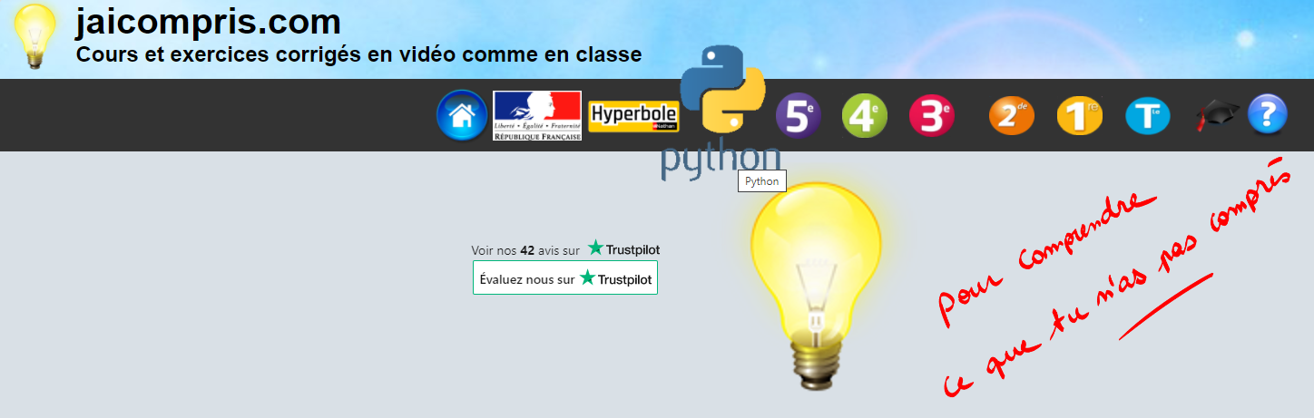 E-Bahut PAVE Posté(e) le 5 décembre 2020 E-Bahut Signaler Posté(e) le 5 décembre 2020 Bonsoir, Conseil qui n'engage que moi : si tu as un ordinateur, soit en y installant par exemple Edupython, soit en utilisant un python en ligne, il te faut disposer de ce langage pour pouvoir l'apprendre et mieux le comprendre... https://www.e-bahut.com/topic/56079-python/ J'ai bien aimé les tutoriels du site jaicompris.com mais il y en a des tas d'autres sur internet... Pour ce qui est de ton problème, on essaiera demain de t'aider 🙂.