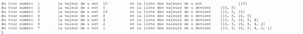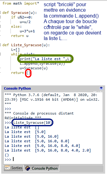E-Bahut PAVE Posté(e) le 22 février 2021 E-Bahut Signaler Posté(e) le 22 février 2021 J'ai un peu amélioré les bricolages... pour t'aider à comprendre ! Tu copies ce script (attention à ne pas le mélanger avec celui que tu à créé.... ). Tu l'exécutes et tu regardes ce que tu obtiens à chaque tour dans la boucle. from math import* def Syracuse(u): if u%2==0: u=u/2 else: u=3*u+1 return u def Liste_Syracuse(u): L=[u] tour=1 print("Au tour numéro ",tour," la liste est ",L) while u!=1: L.append(Syracuse(u)) u=Syracuse(u) tour=tour+1 print("Au tour numéro ",tour," la liste est ",L) return () Citer