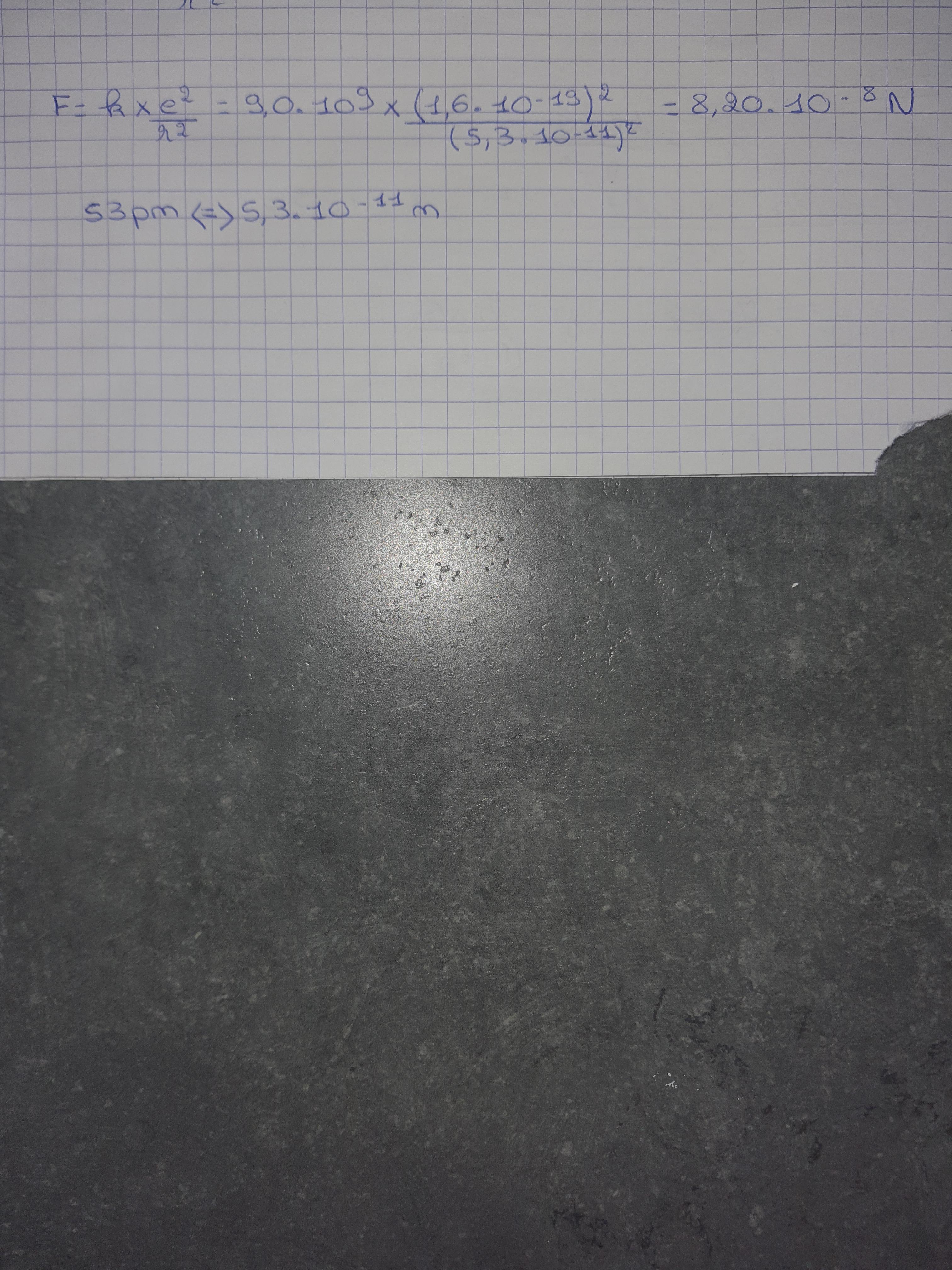 Gogoumo Posté(e) le 14 avril 2021 Signaler Posté(e) le 14 avril 2021 Bonjour, Q1 : Tu as oublié l'électron ! Q2 : La relation correcte est F = k * ( e² ) / r² Attention aux unités. e est en Coulomb , r est en m Un résultat dans lequel manque l'unité est un résultat sans aucune valeur. Citer