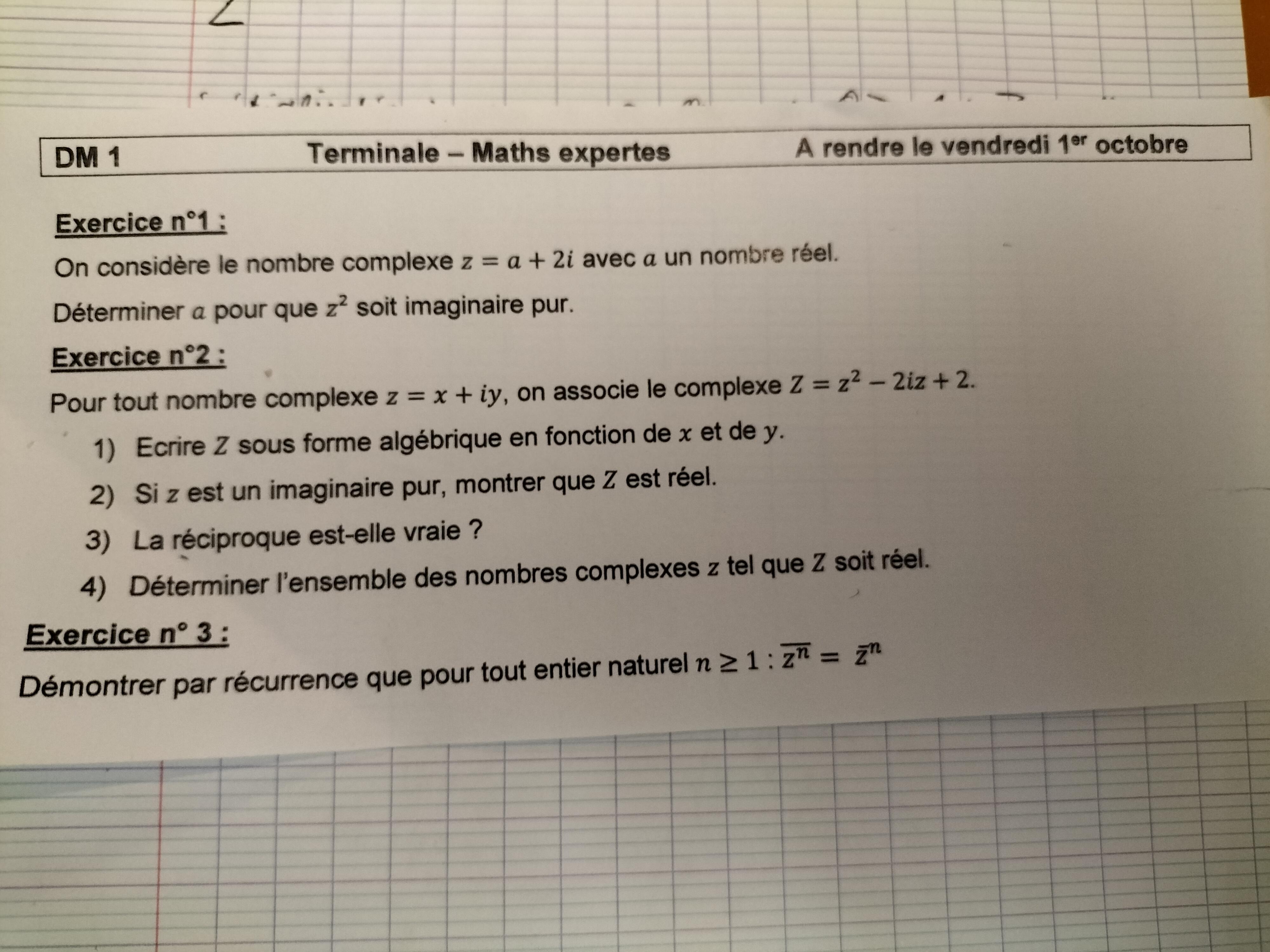 Invité Posté(e) le 30 septembre 2021 Signaler Posté(e) le 30 septembre 2021 Bonsoir, j'ai un devoir de maths pour demain mais j'ai du mal à le comprendre et le faire, j'aimerais bien avoir un petit peu d'aide Exercice n°1 : On considère le nombre complexe z = a + 2i avec a un nombre réel. Déterminer a pour que z^2 soit imaginaire pur. Exercice n°2 : Pour tout nombre complexe z = x + iy, on associe le complexe Z = z^2 - 2iz +2. (attention, il y'a z minuscule et Z majuscule) 1) Ecrire Z sous forme algébrique en fonction de x et de y. 2) Si z est un imaginaire pur, montrer que Z est réel. 3) La réciproque est-elle vraie ? 4) Déterminer l'ensemble des nombres complexes z tel que Z soit réel. Exercice n° 3: Démontrer par récurrence que pour tout entier naturel n⩾1:z^n(barre)=z(barre)^n (barre signifie conjugué) Voilà voilà merci d'avance de votre aide Si besoin le sujet est en pièce jointe Citer