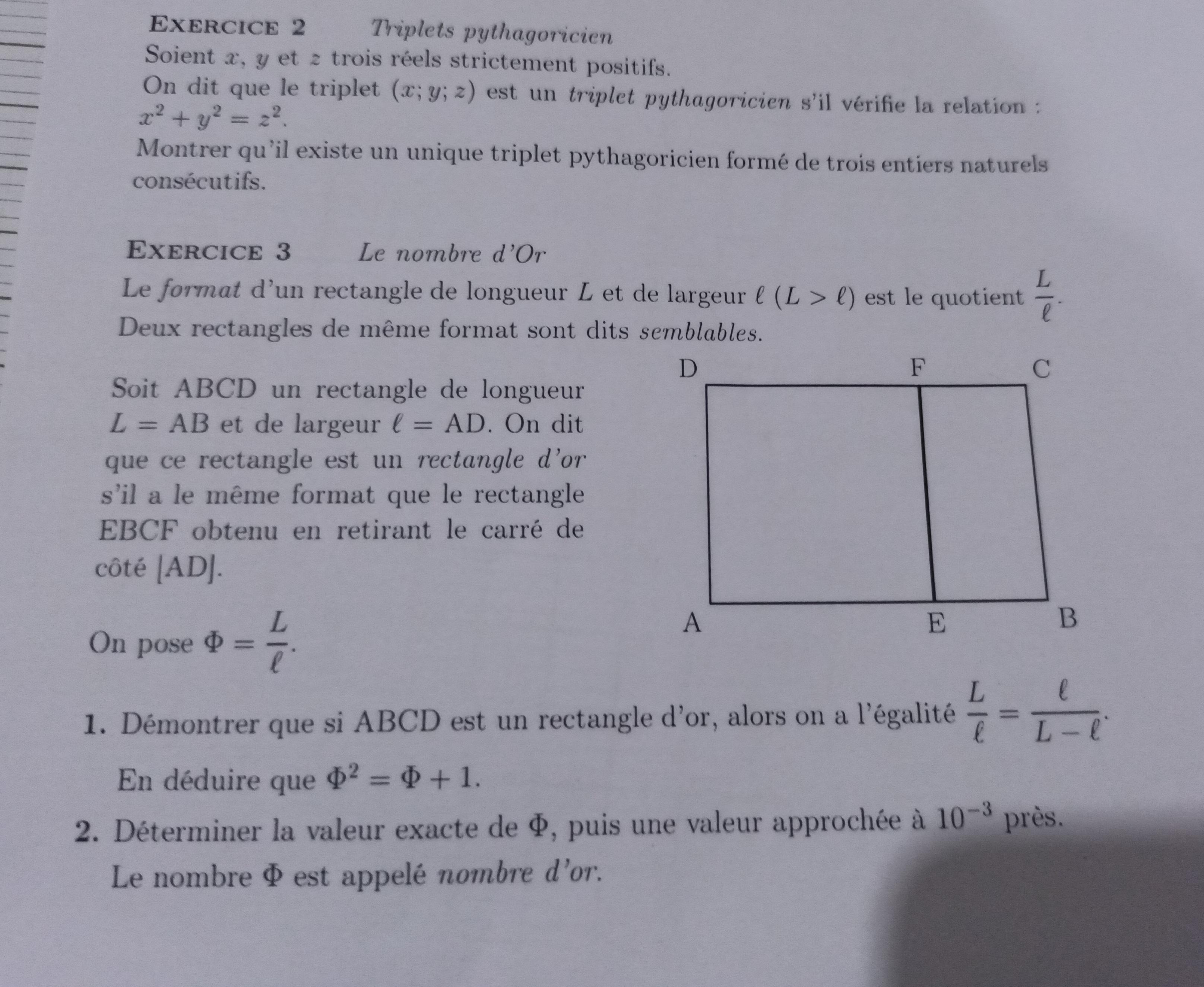 Louis Perche Posté(e) le 2 octobre 2021 Auteur Signaler Posté(e) le 2 octobre 2021 (modifié) Il y a 4 heures, Denis CAMUS a dit : Bonjour, Pour le premier : Si les trois nombres se suivent alors x =x y = x+1 z = x+2 Remplace dans l'égalité de l'énoncé et résous. Donc x²+(x+1)²=(x+2)². Et j'obtiens comme solution x1 = -1, x2 = 3. Je remplace après les x par -1 et 3 et je vérifie bien s'ils sont bien égaux ou pas. Si c'est le cas, il existe donc bel et bien un unique triplet pythagoricien formé de trois entiers naturels consécutifs si je me trompe pas. Dites-moi svp si c'est juste ou pas ce que je vous ai dit. Il y a 4 heures, julesx a dit : Bonjour, Exercice 2 1) Le 1er rectangle a pour largeur l et pour longueur L. Comme on enlève l à la longueur qui devient la nouvelle largeur, le rectangle suivant a pour largeur L-l et pour longueur l. Si les rapports sont conservés, on a L/l=l/(L-l) soit, en divisant par l le deuxième rapport, L/l=1/(L/l-1). Il ne reste plus qu'à remplacer L/l par Ф et à arranger un peu le résultat pour arriver à la relation donnée dans l'énoncé. La suite est triviale. Je vais essayer de comprendre ce que vous me dites et je vous enverrai ma réponse dès que j'ai fini et d'ailleurs Merci à vous et à M. CAMUS. Modifié le 2 octobre 2021 par Louis Perche Citer