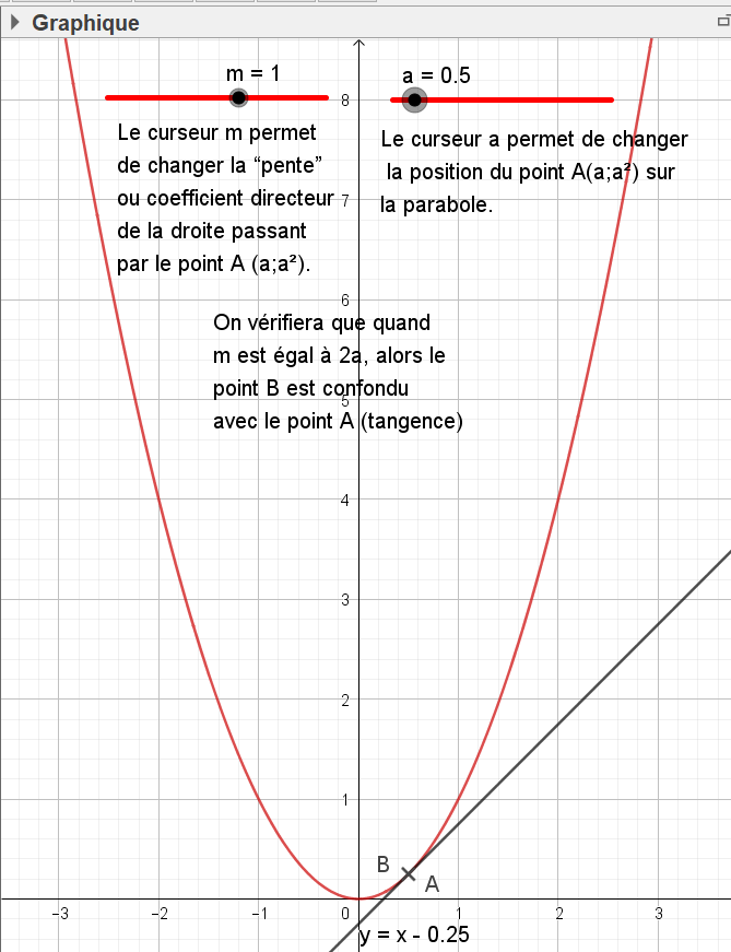 E-Bahut PAVE Posté(e) le 14 octobre 2021 E-Bahut Signaler Posté(e) le 14 octobre 2021 il y a 7 minutes, Louis Perche a dit : Je pense que c'est Texte superflu. J'aurais préféré que tu rédiges. Ta réponse (correcte) est partielle... elle vaut pour une droite quelconque passant par A(a;a²) mais ici on s'intéresse à la droite tangente en A à la parabole. On a montré (question 1) que la droite de coef. directeur m passant par A(a,a²) a pour équation y= mx-am+a^2 donc cette droite est la représentation graphique de la fonction affine (de type y = mx +p) définie par d(x) = mx-am+a^2 Il faut poursuivre : On a montré que si m = 2a, cette droite D d'équation y= mx-am+a^2 n'avait qu'un seul point commun avec la parabole (question 3). L'équation de la droite D lorsqu'elle est TANGENTE à la parabole s'écrit donc :????? Il suffit de remplacer m par 2a pour avoir l'équation de la droite tangente en A(a;a²) à la parabole P. Pour cette tangente que vaut d(x) ???? As tu essayé de voir la figure interactive avec GEOGEBRA ?