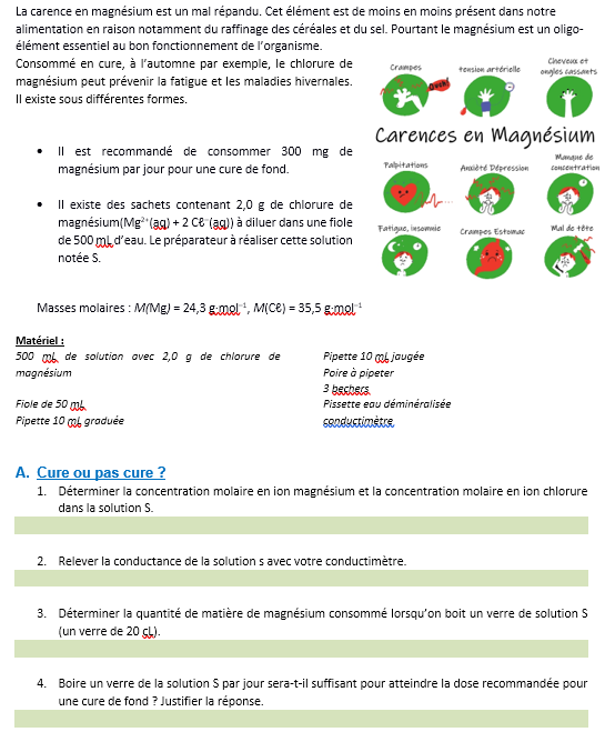 Gogoumo Posté(e) le 20 février 2022 Signaler Posté(e) le 20 février 2022 Bonjour, Question 1 : L'énoncé donne le nom et la formule chimique du soluté. Il donne aussi le volume de la solution S ainsi que les masses molaires atomiques des éléments Magnésium et Chlore Bref, il donne tout ce qui est nécessaire pour répondre à cette question à condition de connaître la définition ( et l'unité ) de la concentration molaire. Citer