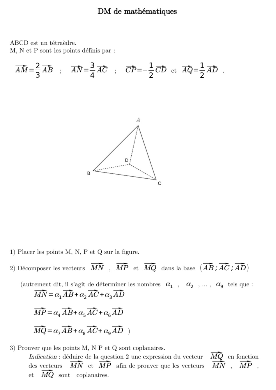 Woufou Posté(e) le 31 décembre 2022 Auteur Signaler Posté(e) le 31 décembre 2022 il y a 35 minutes, julesx a dit : Bonjour, Le vecteur CP est en sens opposé du vecteur CD et sa norme est la moitié de celle de CD, donc égale à 1,05 cm sur la figure. Voir pièce jointe où les dimensions ne sont pas exactement respectées. PS. : Je ne comprends pas ta figure. M est sur le segment AB au 2/3 à partir de A, N est sur le segment AC au 3/4 à partir de A et Q sur le segment AD à la moitié en partant de A. Je viens de comprendre c’est logique ! Le vecteur que l’on cherche est sur le vecteur avec lequel on le decris mais on prend la dimension indiquée et pour celui ou il y a un moins on prend l’opposé il y a 17 minutes, PAVE a dit : Bonjour à vous deux, Si ma représentation (faussement 3D) peut aider Amélia... Merci je viens de comprendre grace a vos 2 explications ! Citer