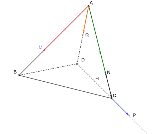 E-Bahut julesx Posté(e) le 31 décembre 2022 E-Bahut Signaler Posté(e) le 31 décembre 2022 Bonjour, Le vecteur CP est en sens opposé du vecteur CD et sa norme est la moitié de celle de CD, donc égale à 1,05 cm sur la figure. Voir pièce jointe où les dimensions ne sont pas exactement respectées. PS. : Je ne comprends pas ta figure. M est sur le segment AB au 2/3 à partir de A, N est sur le segment AC au 3/4 à partir de A et Q sur le segment AD à la moitié en partant de A. Citer
