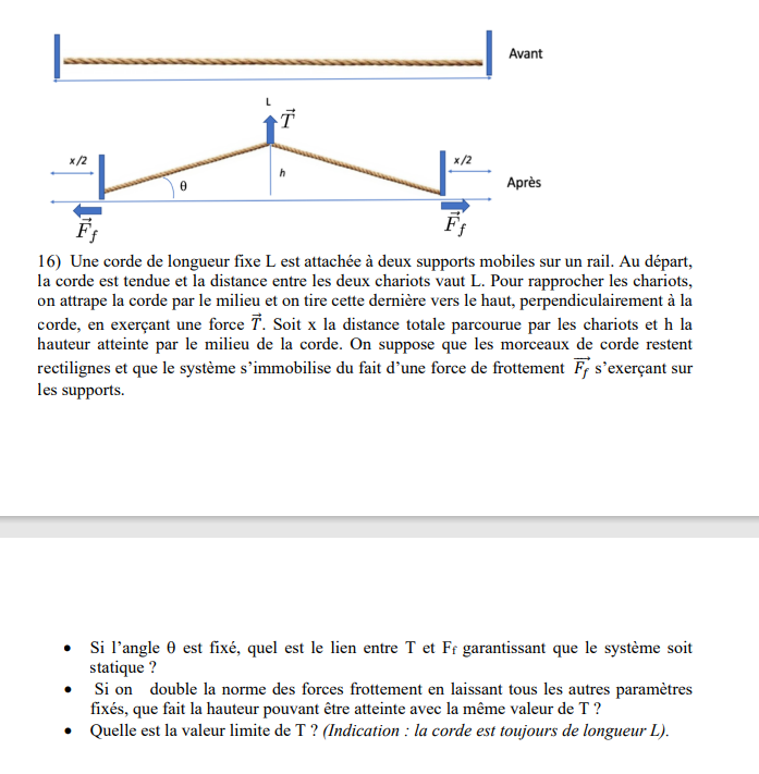 Thms89 Posté(e) le 13 août 2023 Signaler Posté(e) le 13 août 2023 Bonjour, pourriez vous m'aider à résoudre ce problème s'il vous plait ? Je ne sais pas trop quoi répondre, à part que la force T doit être égale à 2*Ff pour la première question... et je ne sais pas si c'est bon. Citer